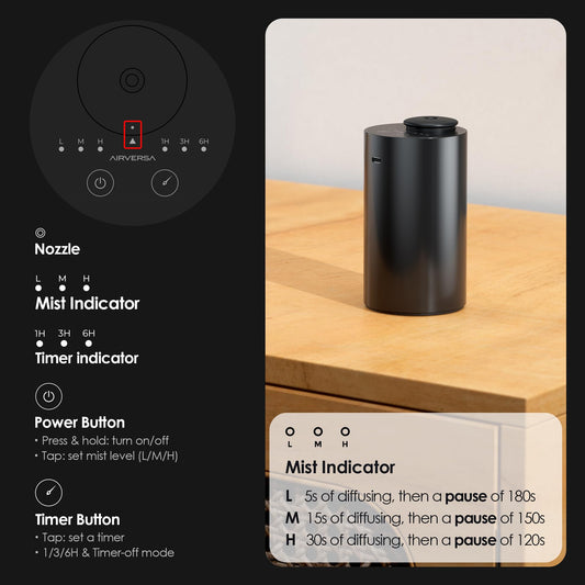 Airversa Waterless Diffuser for Essential Oil, Battery Operated Nebulizer, 0.7 Fl.Oz./ 20mL Capacity, Mini Scent Air Machine, 3 Countdown Timers & 3 Mist Levels for Home, Room, Car, Office - AN6 Black
