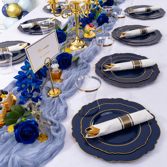 Liacere 350PCS Navy Blue Plastic Plates-Disposable Blue Gold Plates 50guest Plastic Dinnerware include 100Plates,50Pack Pre Rolled Napkins with Silverware 50Cups for Wedding&Back to School&Labor Day