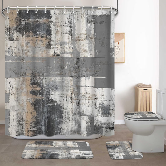 Lnond 4Pcs Bathroom Shower Curtain Sets with Rugs,Black and Grey Painting Art Bathroom Sets with Shower Curtain and Rugs and Accessories