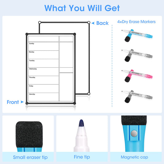 Magnetic Weekly Calendar for Fridge,12×8” , Doubleside, Grocery List, Kitchen Menu Planner Board for Fridge/Locker, 4 Marker