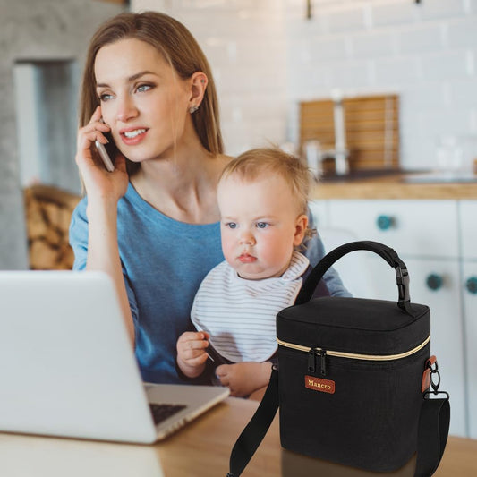 Mancro Breastmilk Cooler Bag with Ice Pack, Fits 6 Baby Bottles Up to 9 Ounce Insulated Baby Bottle Bag, Breast Milk Cooler on The go with Strap, Bottle Storage Bag for Nursing Mom Daycare, Black