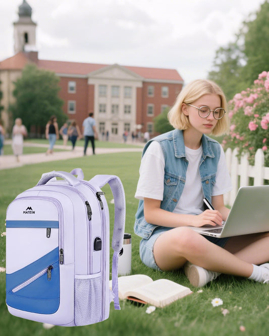 MATEIN Womens College Backpack, Stylish Casual Bag with Trolley Sleeve Fits 17 Inch Laptop, Water Resistant Work Commute Daypack with USB Charging Port, Graduation Gifts, Purple Blue