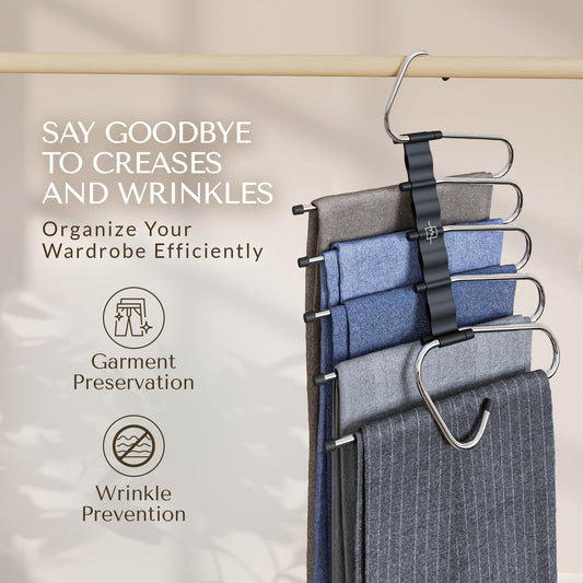MORALVE Pants Hangers Space Saving - 2 Pack - Non-Slip Multi-Layer Space Saving Hangers - Multifunctional Clothing Rack for Closet Storage - Ideal for Jeans, Trousers, Skirts, Scarves & Slacks (Black)
