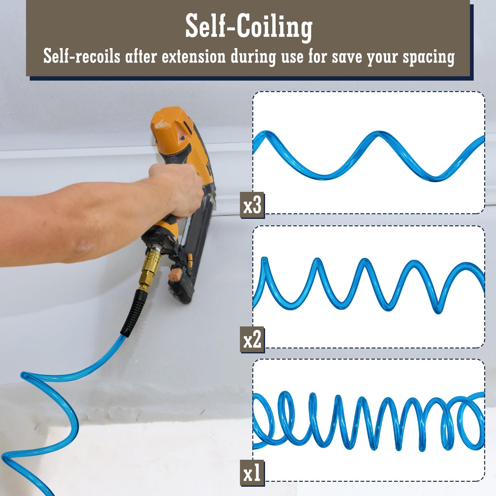 • HIGH-QUALITY POLYURETHANE MATERIAL:Made from high-quality Polyurethane materials, the 1/4 air hose is durable and built to last. The PU spring tube provides excellent elasticity and recovery capabilities, ensuring that the hose retains its shape even after repeated use. And with its PVC protective sleeve, this air line is resistant to abrasions and punctures, making it ideal for use in even the toughest environments.