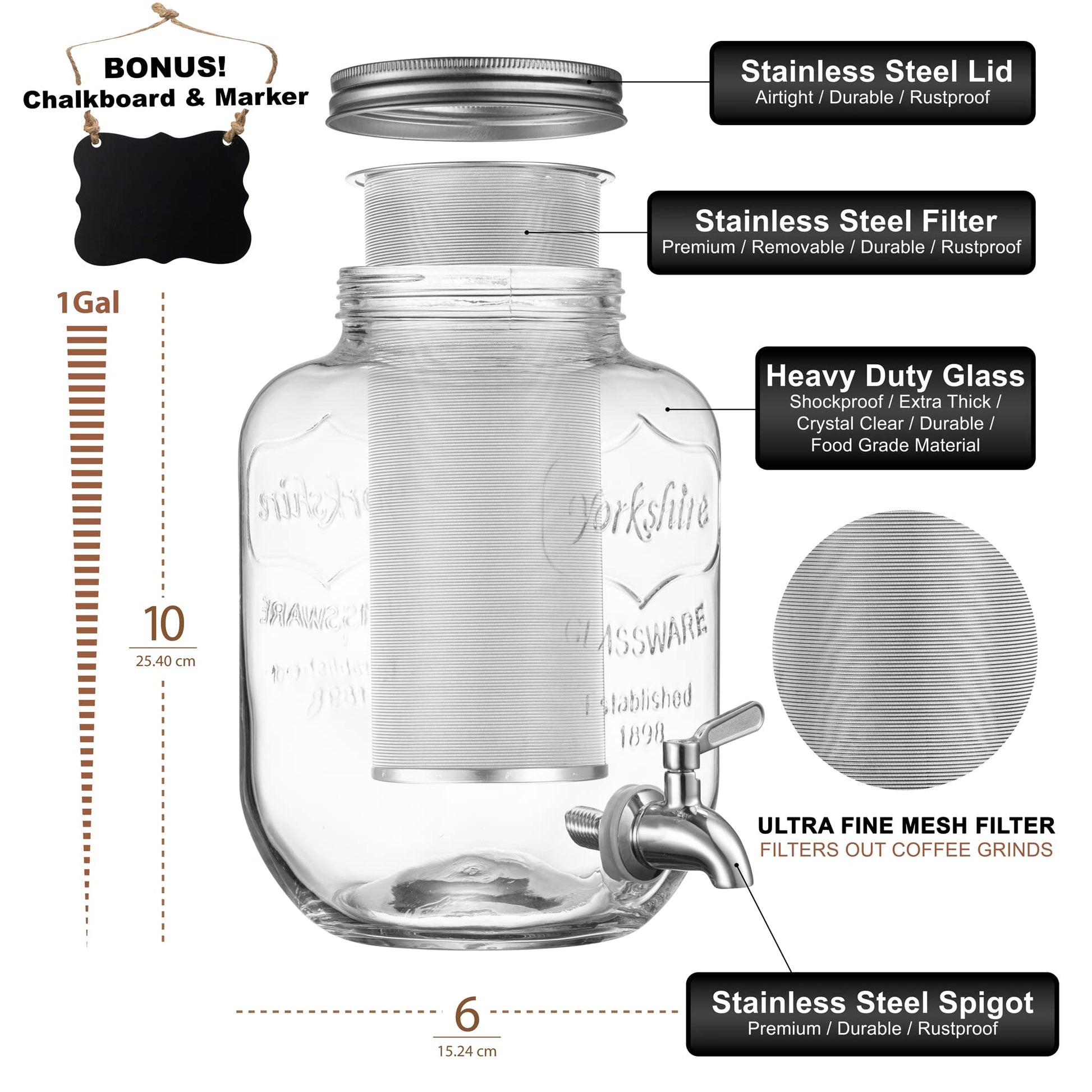 1 Gallon Cold Brew Coffee Maker - 3rd Generation Fine Mesh Filter - Stainless Steel Spigot - Extra Thick Large Glass Mason Jar Drink Dispenser Carafe, Iced Coffee Maker & Sun Tea Pitcher with Infuser.