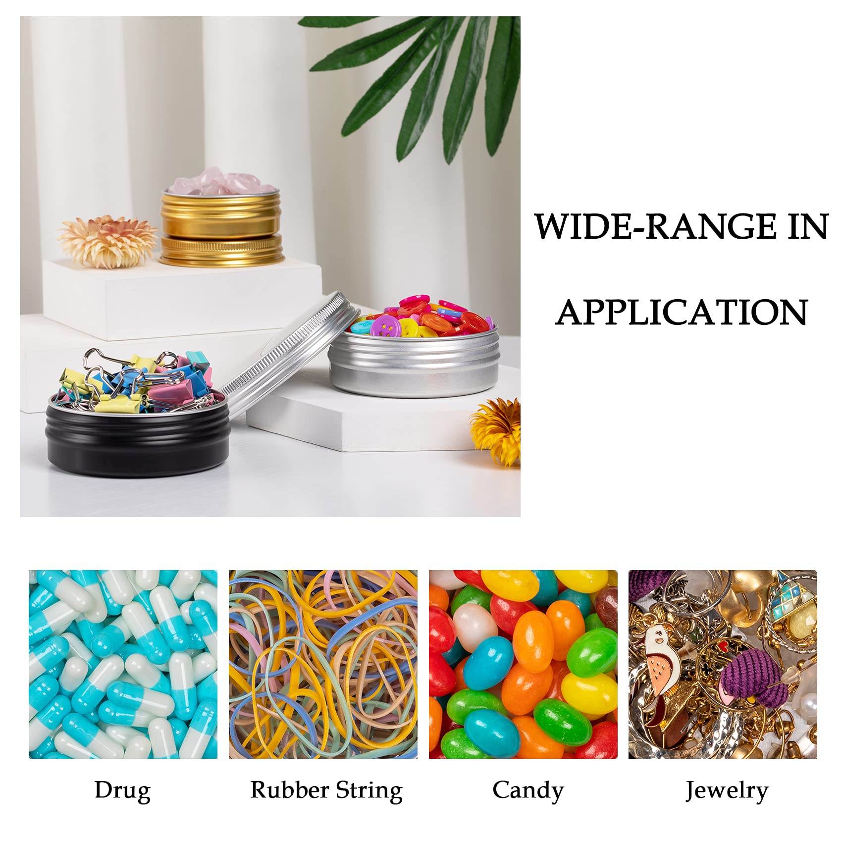 • APPLICATION: Our food-grade aluminum tin containers are dynamic storage jars, ideal choice for storing a wide variety of items like crafts, lip balms, lip gloss, mini candles, cosmetics, sample pots, herbs, handmade lotions