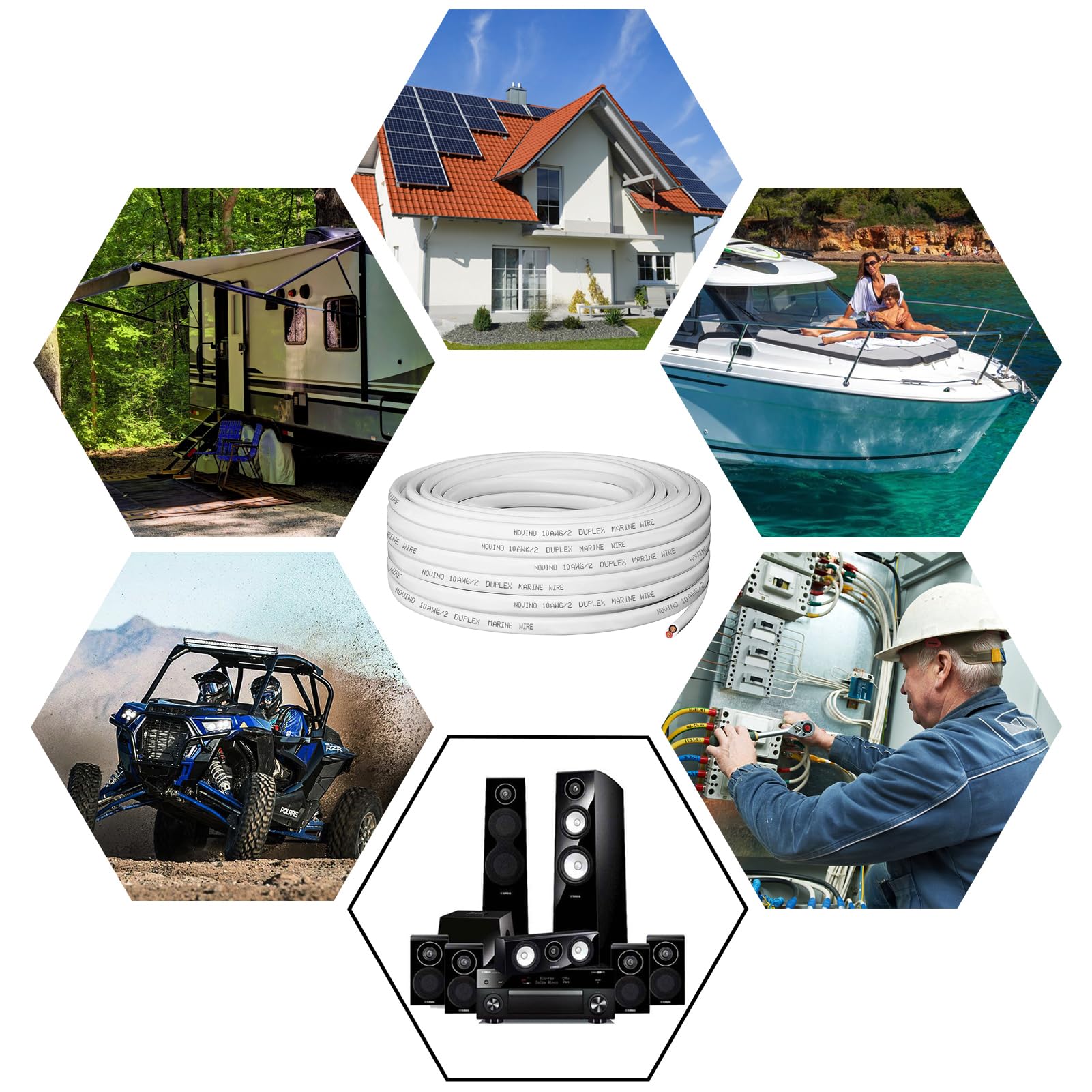 • Multi Use: the 10 gauge marine wire tinned use in pontoon boat/bass boat/boat trailer/ fish finder/truck/RV/Van/ATV trailer electrical system:wiring light (spotlight,underwater light,flood light, navigation lights,headlight), solar inverters, shore power,bilge pump,extend new bank charger leads, speaker wire,electric brake wires, radio stereo, alarm etc
