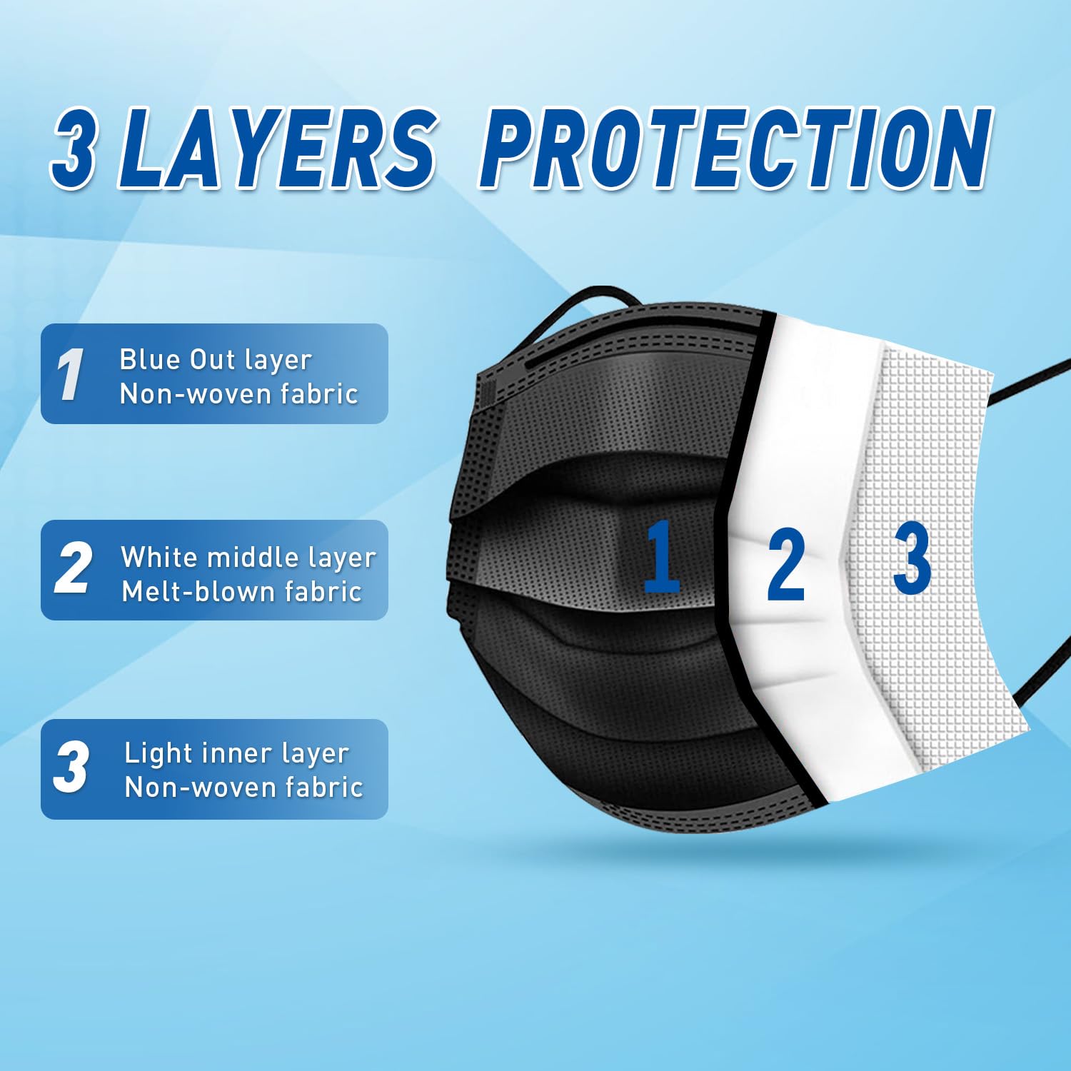 • High Quality 3 Layer Face Masks: 100 Pack Disposable Black Face Mask. 3 layer black disposable face mask with white inside