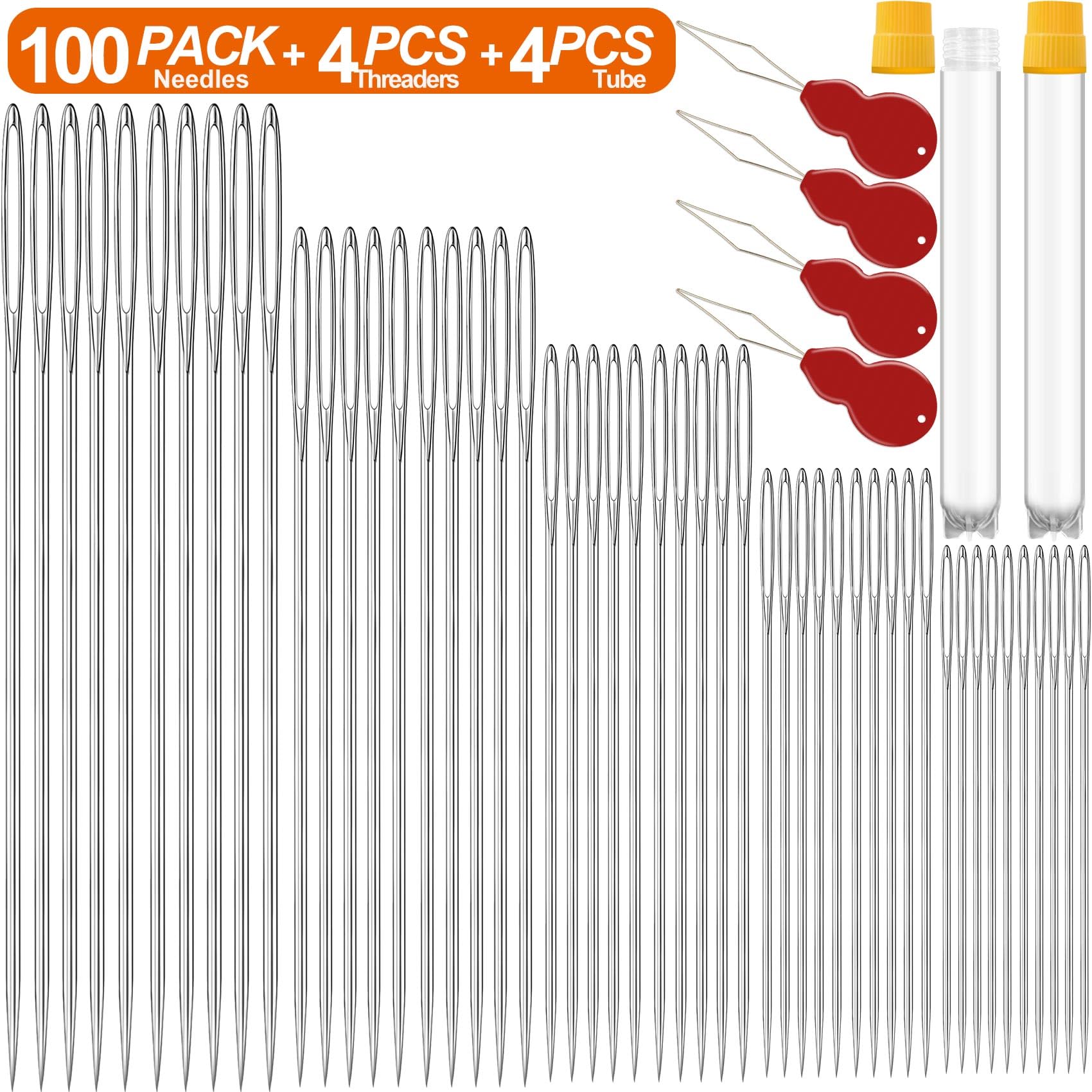 100 Pack Premium Large Eye Needles for Hand Sewing with 4 Needle Threaders, Assorted Sizes, Embroidery Needles for Hand Sewing, Sewing Needles Large Eye, Big Eye Needle