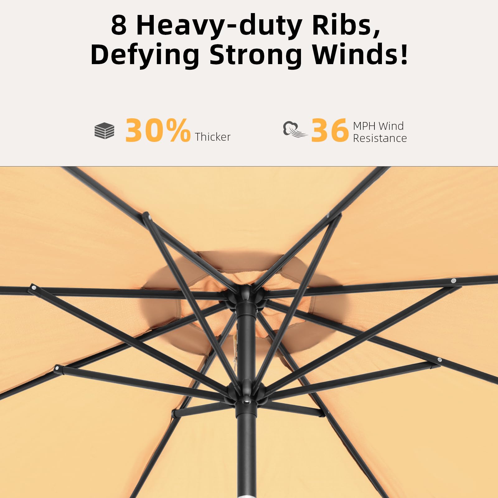 • Sturdy Frame Structure: Our outdoor umbrellas for patio has 8 steel ribs and 1.5-inch thickened umbrella columns to provide strong support, and a heavy base to ensure wind-resistant stability, so you are not afraid of wind and rain. Note: If used as an independent patio umbrellas, it must be paired with an Umbrella BASE weighing more than 44 pounds/20 kg(not included)