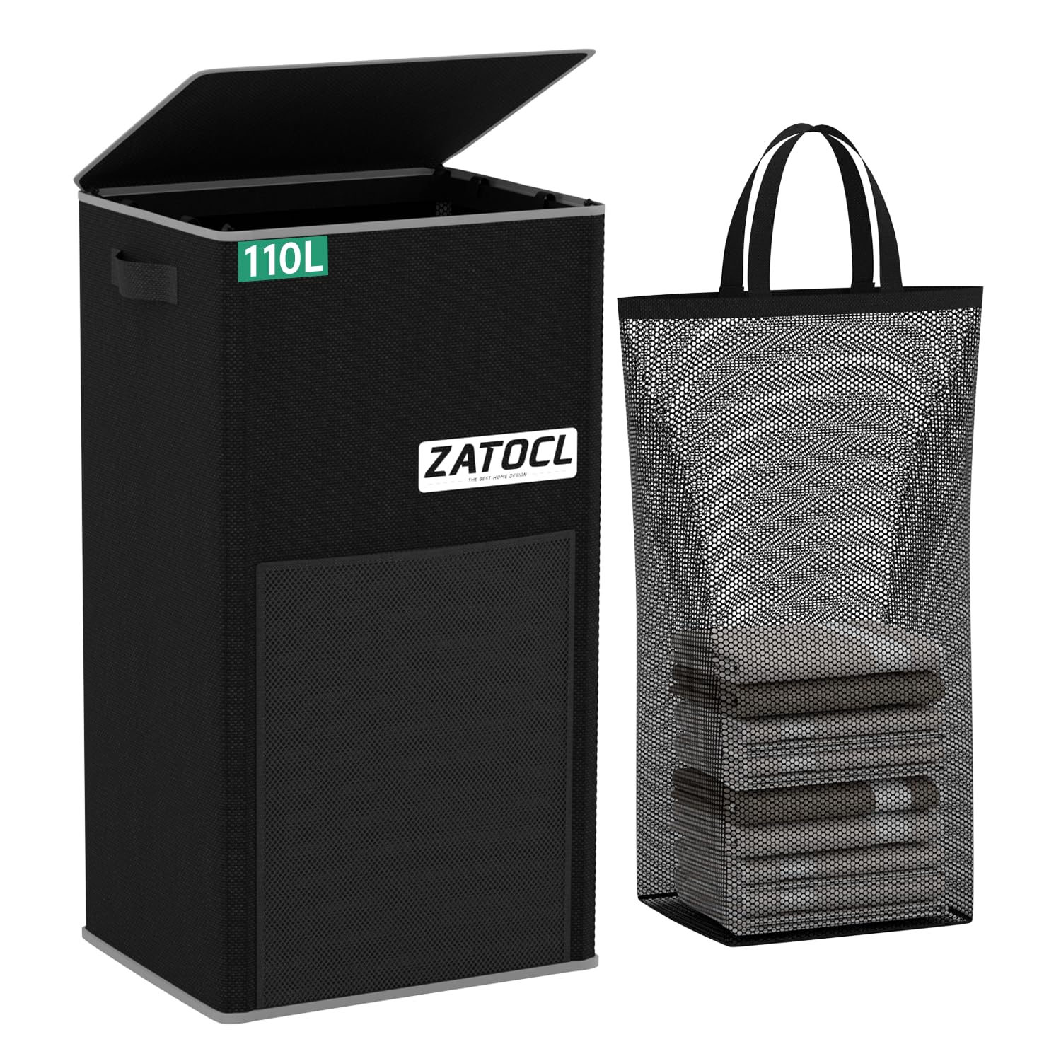 110L Laundry Hamper with Lid with Washing Bag & Front Mesh Bag, Large & Tall Laundry Basket, Collapsible Dirty Clothes Hampers for Bedroom Aesthetic, Bathroom, Dorm, Laundry Room - Easy Carry, Black