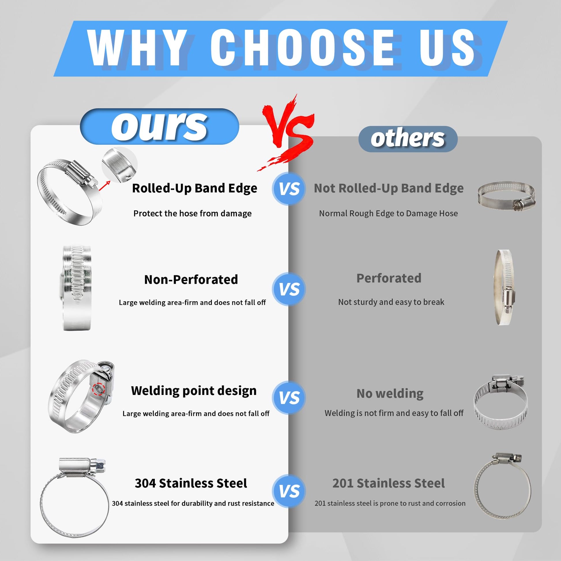 • [Protect Your Hose] Band has rolled edges to prevent cutting damage to hoses, PVC pipes, and rubber pipes, which could lead to leaks. Our clamps are different from ordinary ones as they do not have perforations. This design prevents the hose from being damaged by squeezing through the holes in the band.