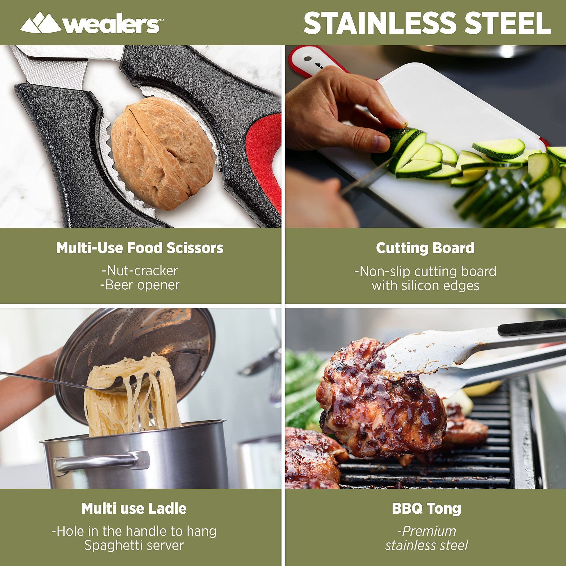 • MULTIPURPOSE: The trendy kit can be used for multiple applications, perfect for concerts, sporting events, hiking, boat rides, mountaineering and BBQ’s. The weather retardant the travel utensil kit is the perfect camp kitchen accessory, and it holds all your essential outdoor cooking utensils.
