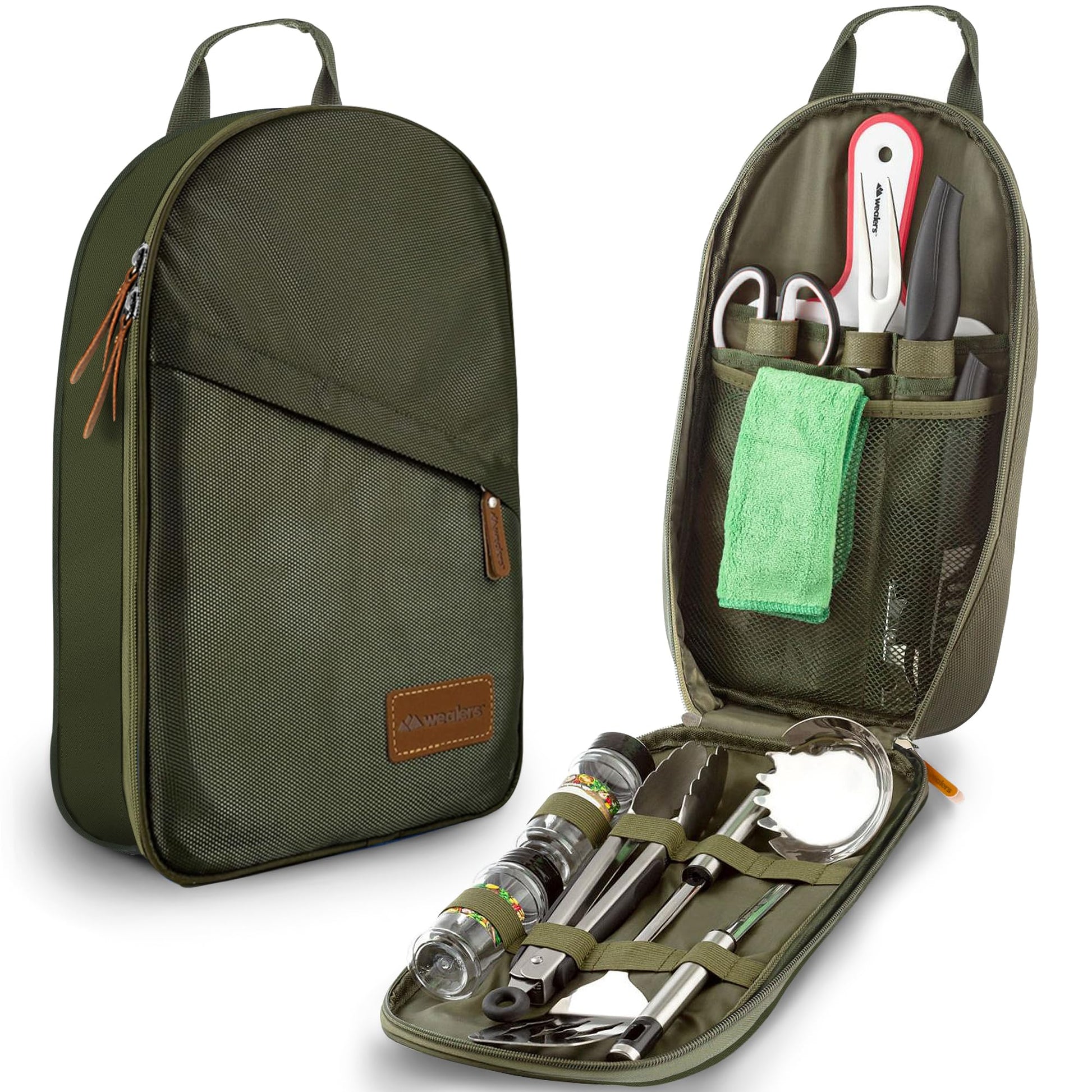 12 Piece Camp Kitchen Cooking Utensil Set Travel Organizer Grill Accessories Portable Compact Gear for Backpacking BBQ Camping Hiking Travel Cookware Kit Water Resistant Case (Green)