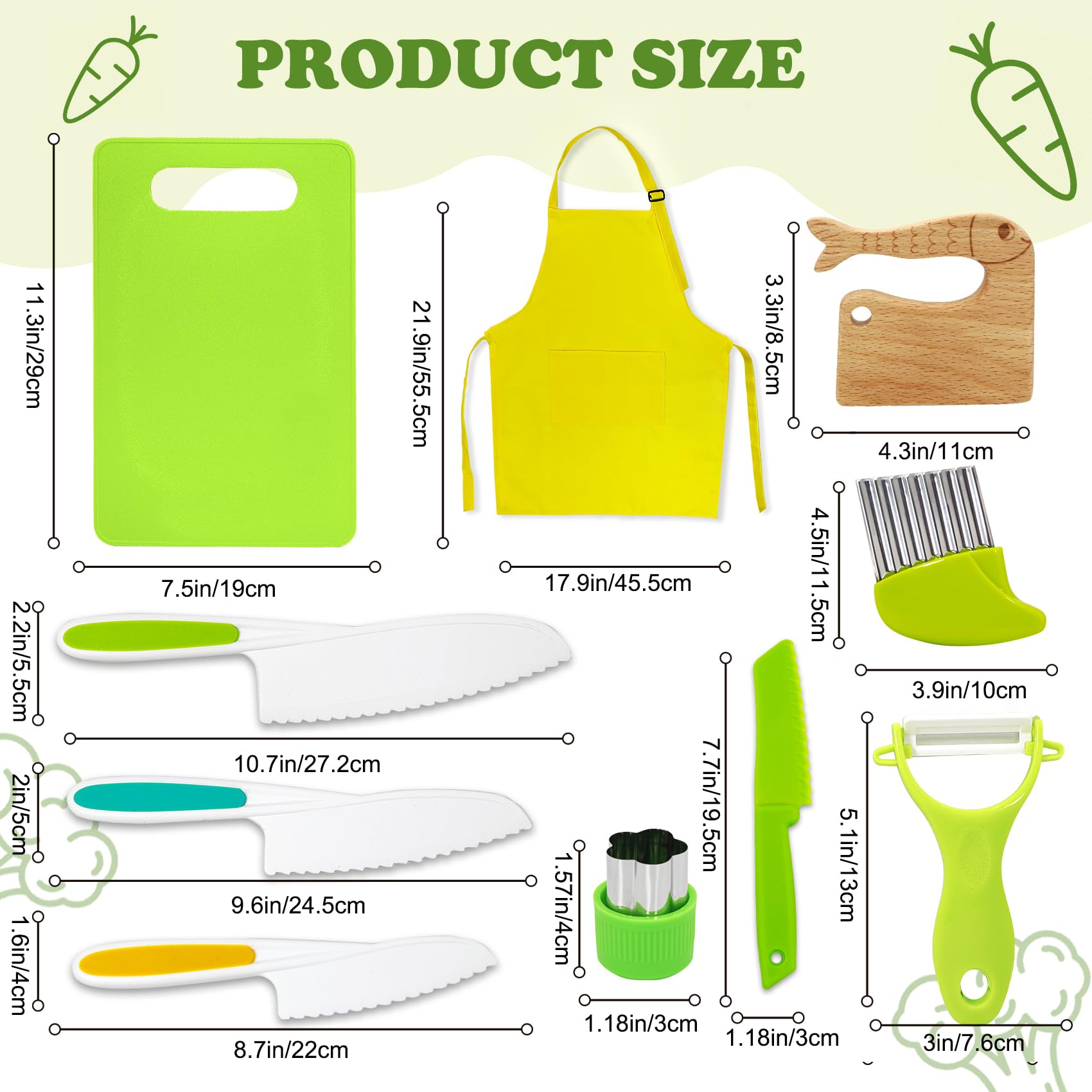 • 【The Package Includes】: The kids knifes set Package Includes 1 x Cooking knife, 1x Y peeler, 1 x Wooden kids knife, 2 x Apron, 2 x Cutting Board, 3 x Serrated Edges Toddler Knives, 4 x Sandwich Cutters, 1 x Crinkle Cutter, a variety of styles and uses of toddler kitchen tools can meet the needs of kids usage requirements.