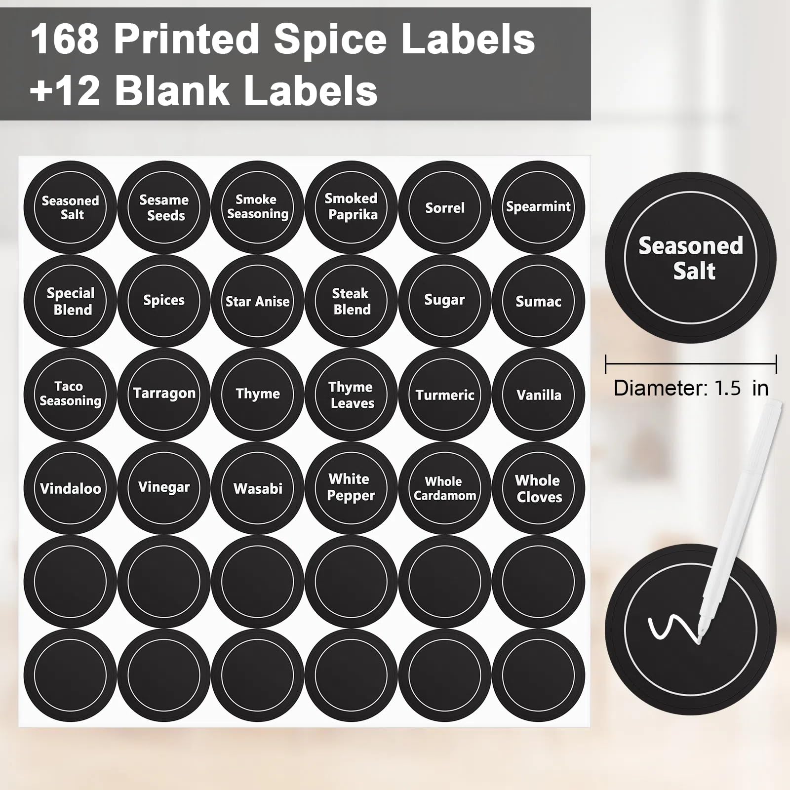180 Spice Labels for Food Containers, Chalkboard Labels for Jars, Spice Label Stickers Herb Seasoning Kitchen Pantry Labels, Small Chalk Sticker Spice Jar Label Round 168 Printed, 1 Erasable Chalk