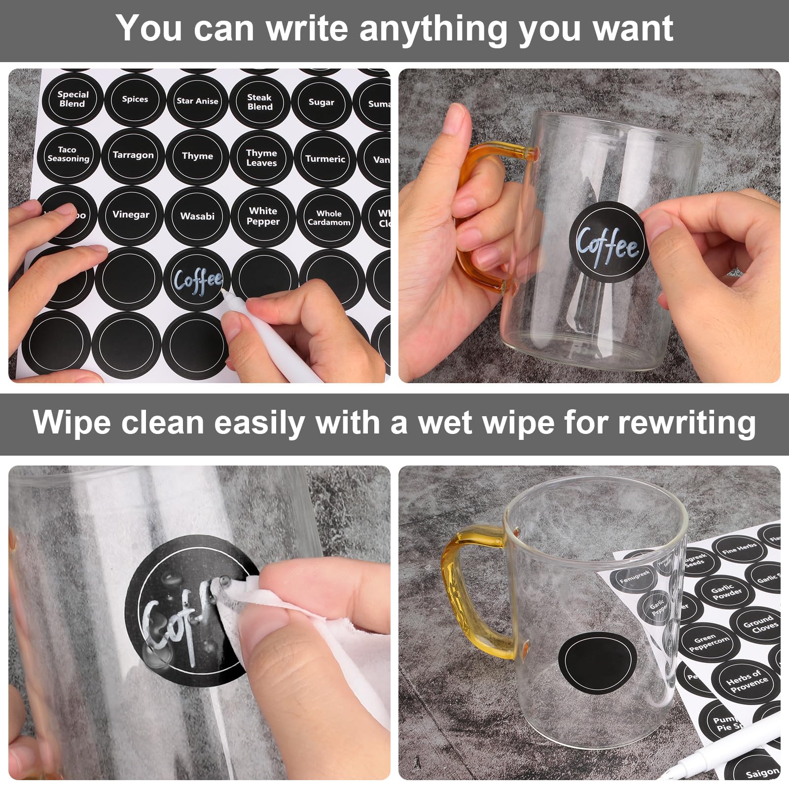 • USAGE TIPS OF LABEL STICKERS FOR CONTAINERS: Make sure the surface is clean and dry before attaching the chalkboard stickers. Use a hair dryer to heat up the sticker first if you need to remove it. The blank label stickers are reusable as words written can be erased with wet wipes.