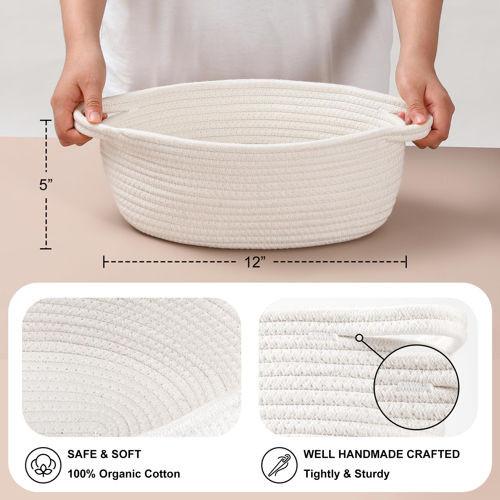• Organic Cotton Woven: Our small boo woven basket is made of 100% organic cotton, 2 Pack white all 12"x 8"x 5", this makes the material incredibly soft and gentle. The natural cotton rope used in weaving is free of harsh chemicals, making it a reassuring choice for families with young ones.