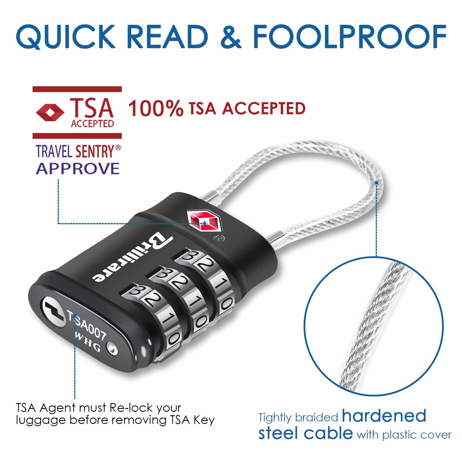 • TSA APPROVED: TSA accepted lock allows TSA staff to inspect & re-lock your baggage without damaging the lock through 600+ airports worldwide. Adopts patented internal mechanism, 8-10 times stronger, won't rust or freeze up even after years of use