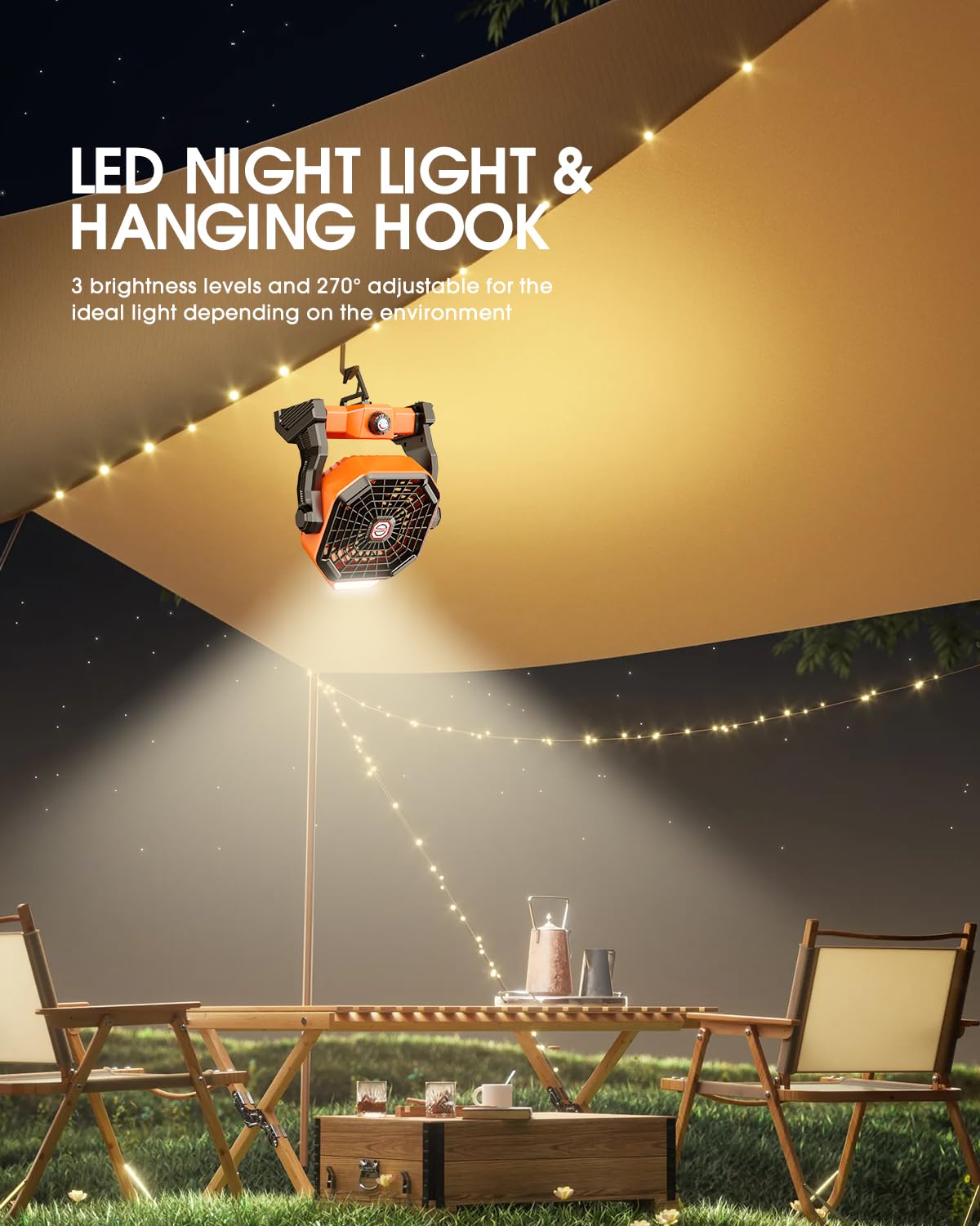 • 【Adjustable & Durable Design】– This rechargeable fan features a 270° adjustable rotation, allowing you to direct the airflow exactly where you need it. The built-in hanging hook makes it easy to suspend in a tent, saving space while keeping you cool. Crafted from sturdy ABS material, it withstands impacts, making it perfect for outdoor adventures. Plus, its stylish punk-inspired design doubles as a sleek desk fan for indoor use.