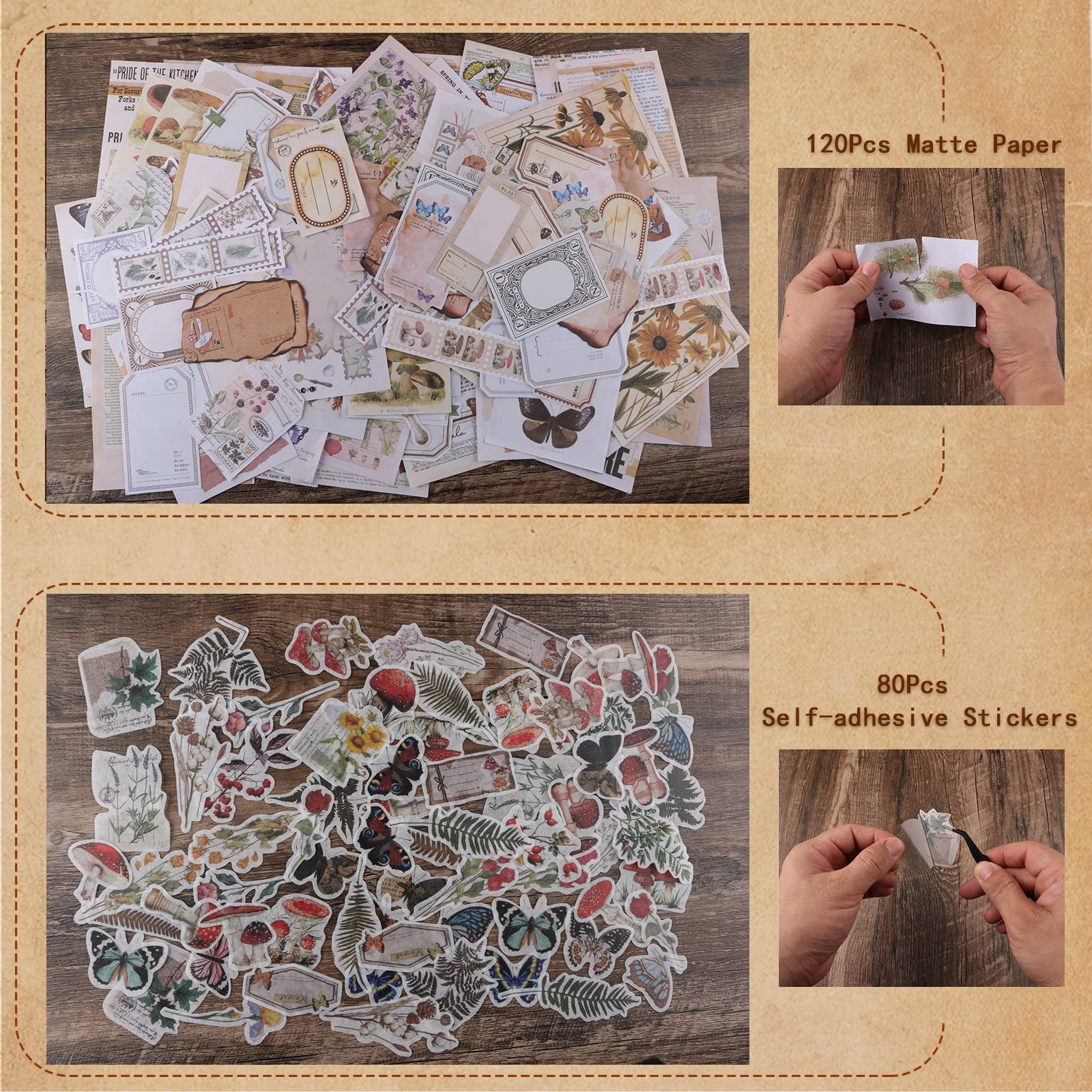 • 【 Forest Theme】 200 Pieces forest theme assorted paper & stickers, including butterfly, fern, mushrooms, flowers, animal, trees, jungle, rabbits, owls, birds etc. Perfect for junk journals, scrapbooking, collages, or forest-themed art projects!