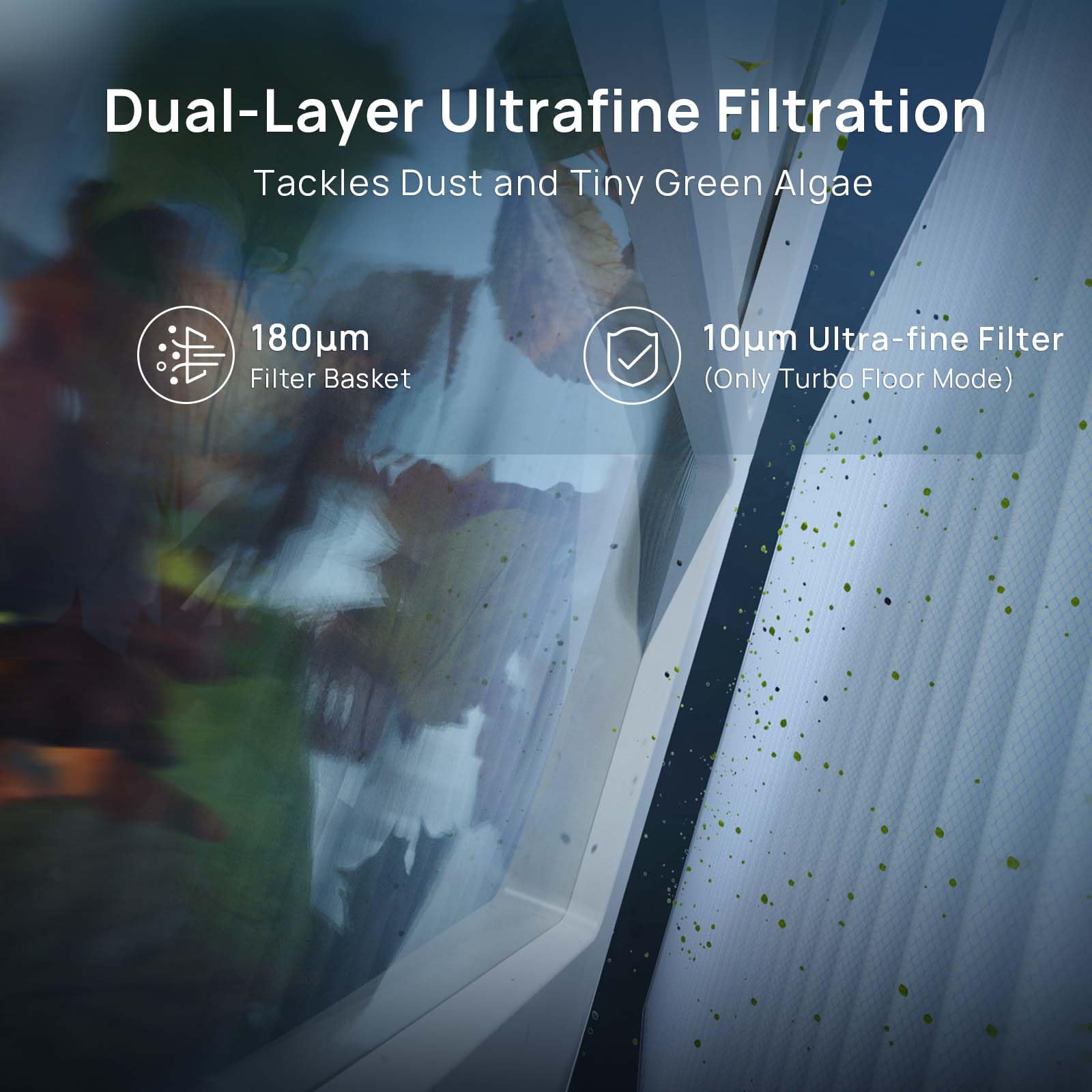 • Ultra-Fine Dual-Layer Filtration: To thoroughly remove fine particles such as green algae, dust, and sand, you can install a 10-micron ultra-fine HEPA filter as a secondary filter in “Turbo Floor” mode