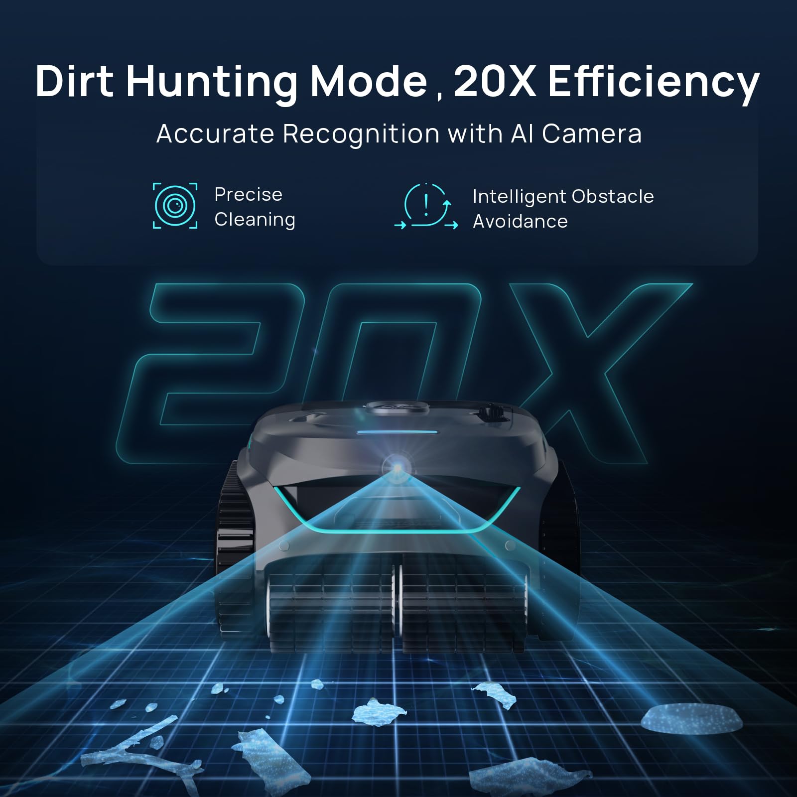 • AI Learning Enables a Customized Pool Database: In the first month, the AI will learn more about debris and obstacles to plan optimal path, allowing it to become your customized pool cleaning robot with up to 20x efficiency improvement