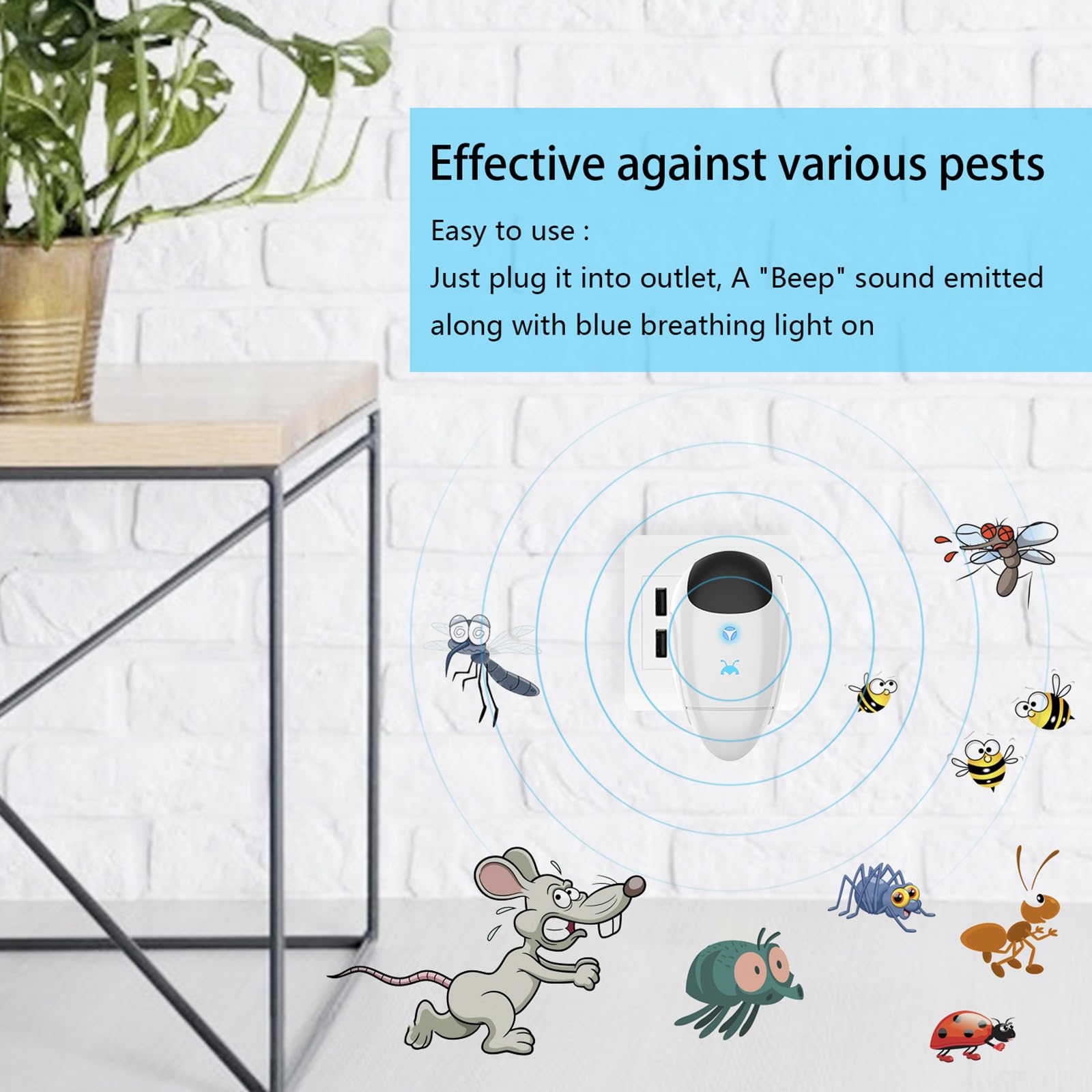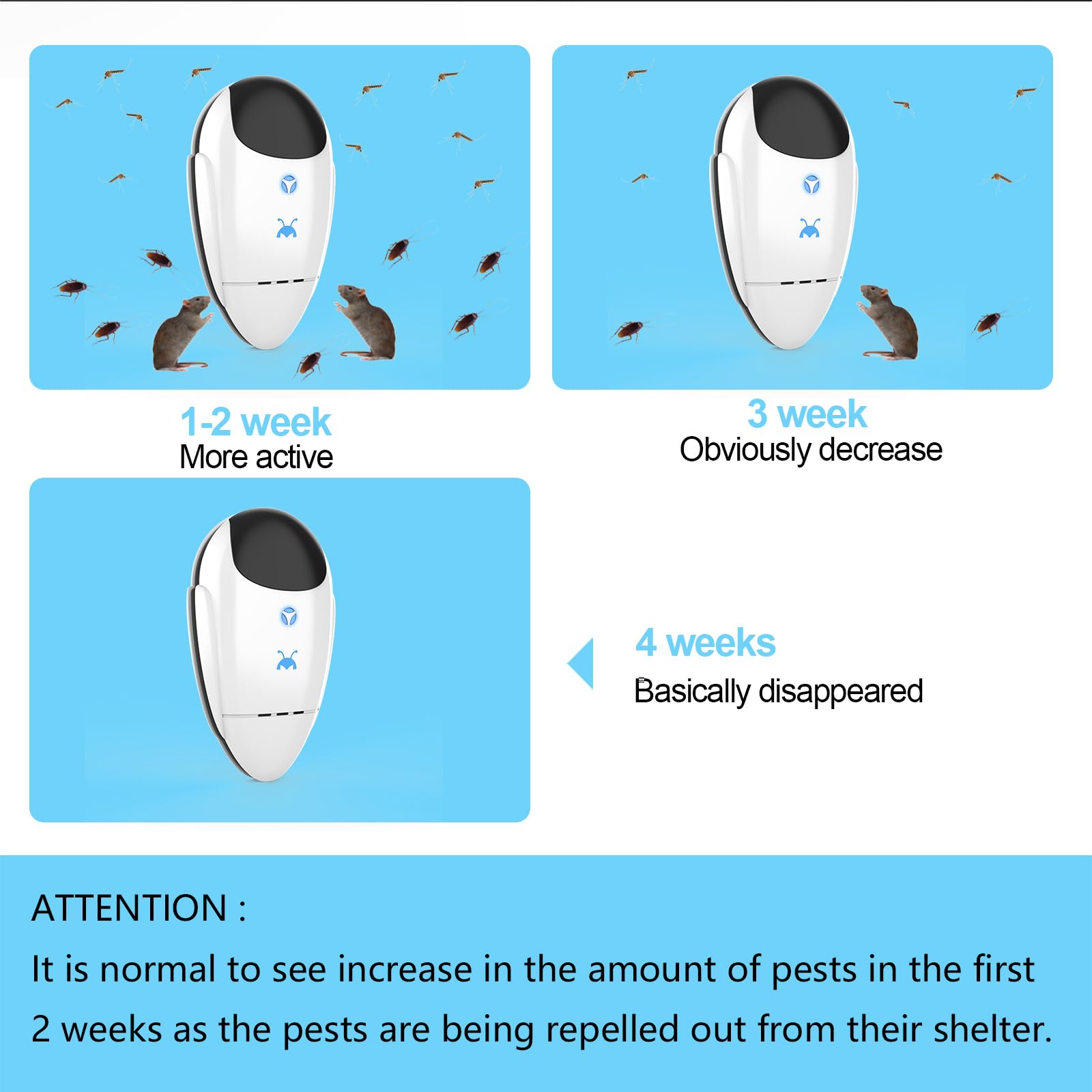 • Easy to Use: Just plug this device into any standard outlet, and you’ll hear a “beep” with a soothing blue breathing light to confirm it’s active. Noticeable results typically begin within 2-4 weeks as pests are gently prompted to relocate. Note: A temporary increase in pest activity may occur in the first 2 weeks as they move out of hiding.