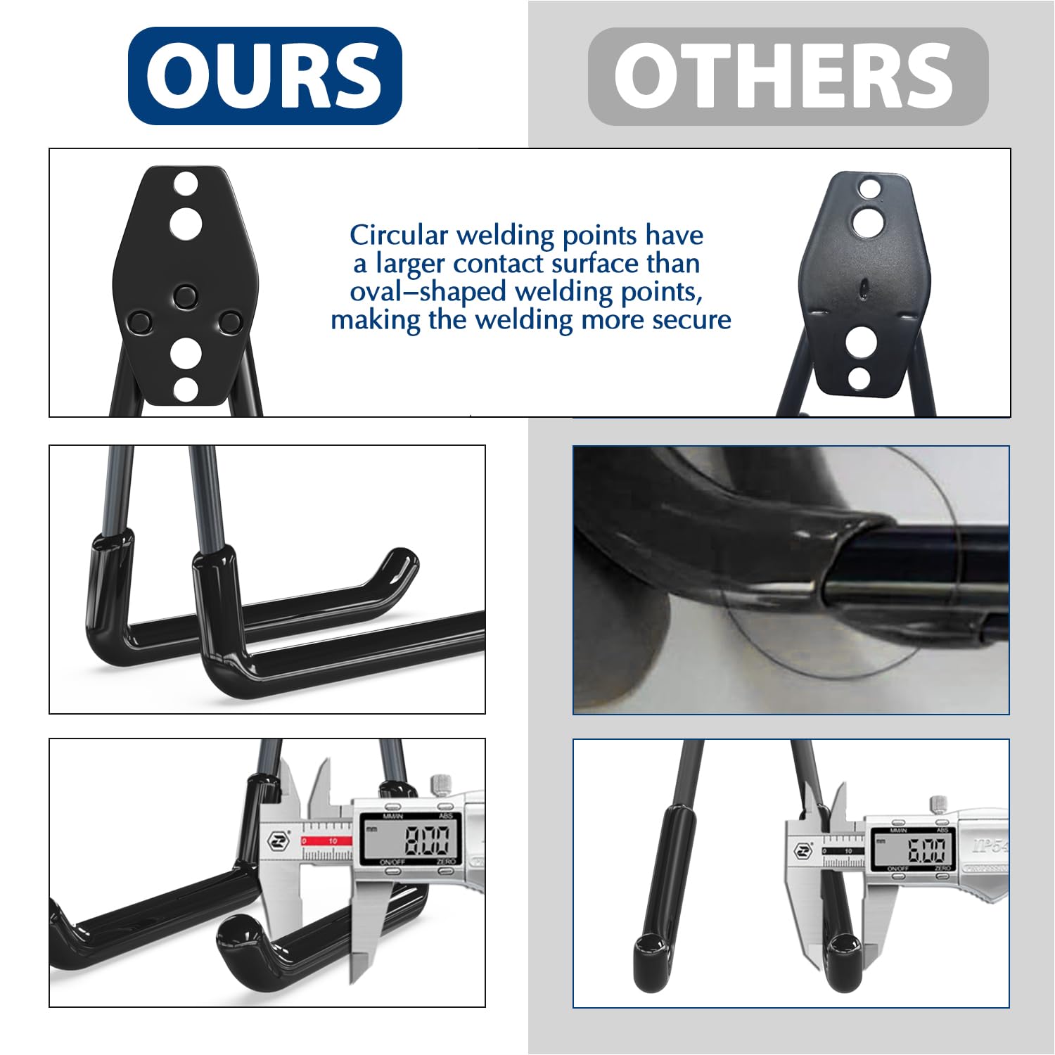 • Upgrade Design-Triangle 3 Welding Dot Support: Different from other similar garage hooks with only 2 welding spots, we designed 3 welding dot to connect the garage tool organizer with the base, offering higher security and no worrying about the rear steel panel splitting or falling off, a perfect choice of wall hooks for hanging heavy duty