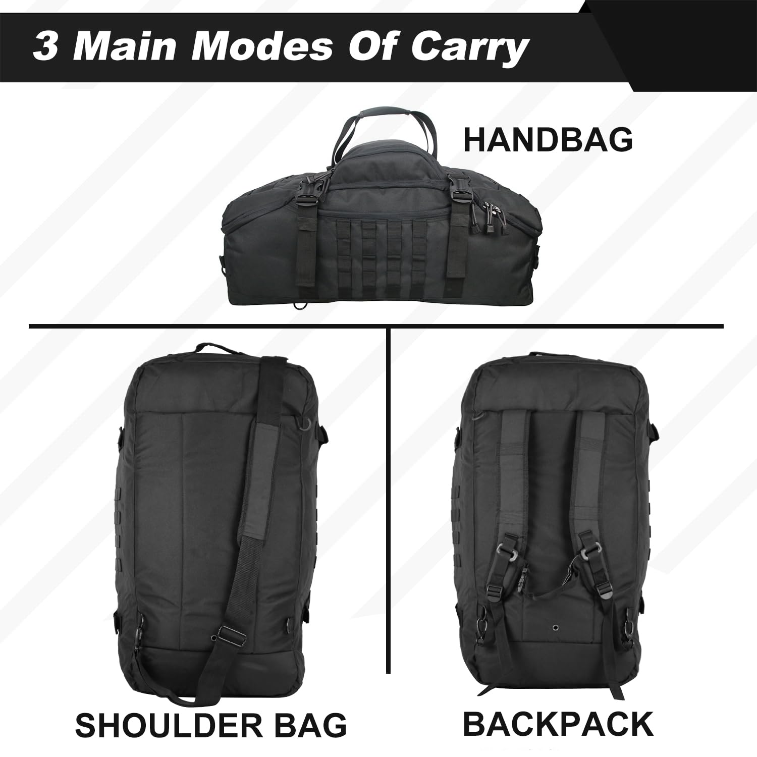There is a double-reinforced top handle. A removable shoulder strap.It can also be used as a backpack. The padded backpack straps with sternum strap can be stowed in the large pocket on the back of the bag. The outside of the bag is wrapped with High tensile strength nylon MOLLE webbing.