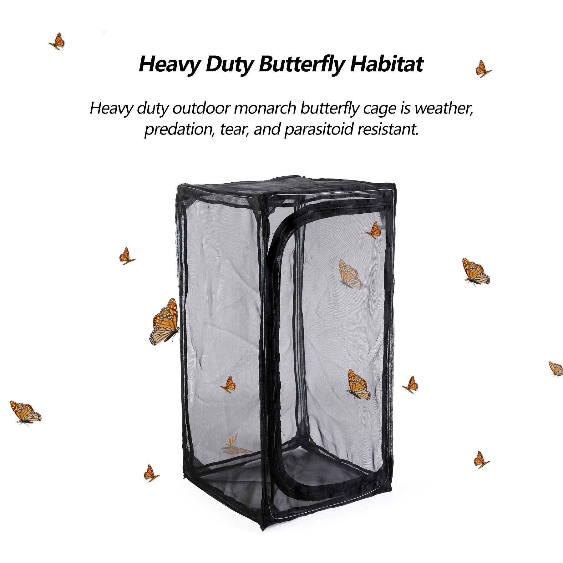 Collapsible design for easy storage and reusable, the unfolded measures: 15 x 15 x 30 inches. Tall and wide, can hold large 4 of 3 feet tall milkweed plants. Raise up to 40 caterpillars at a time in one enclosure. The wings of a new butterfly are not risk of breaking when trying to stir up.