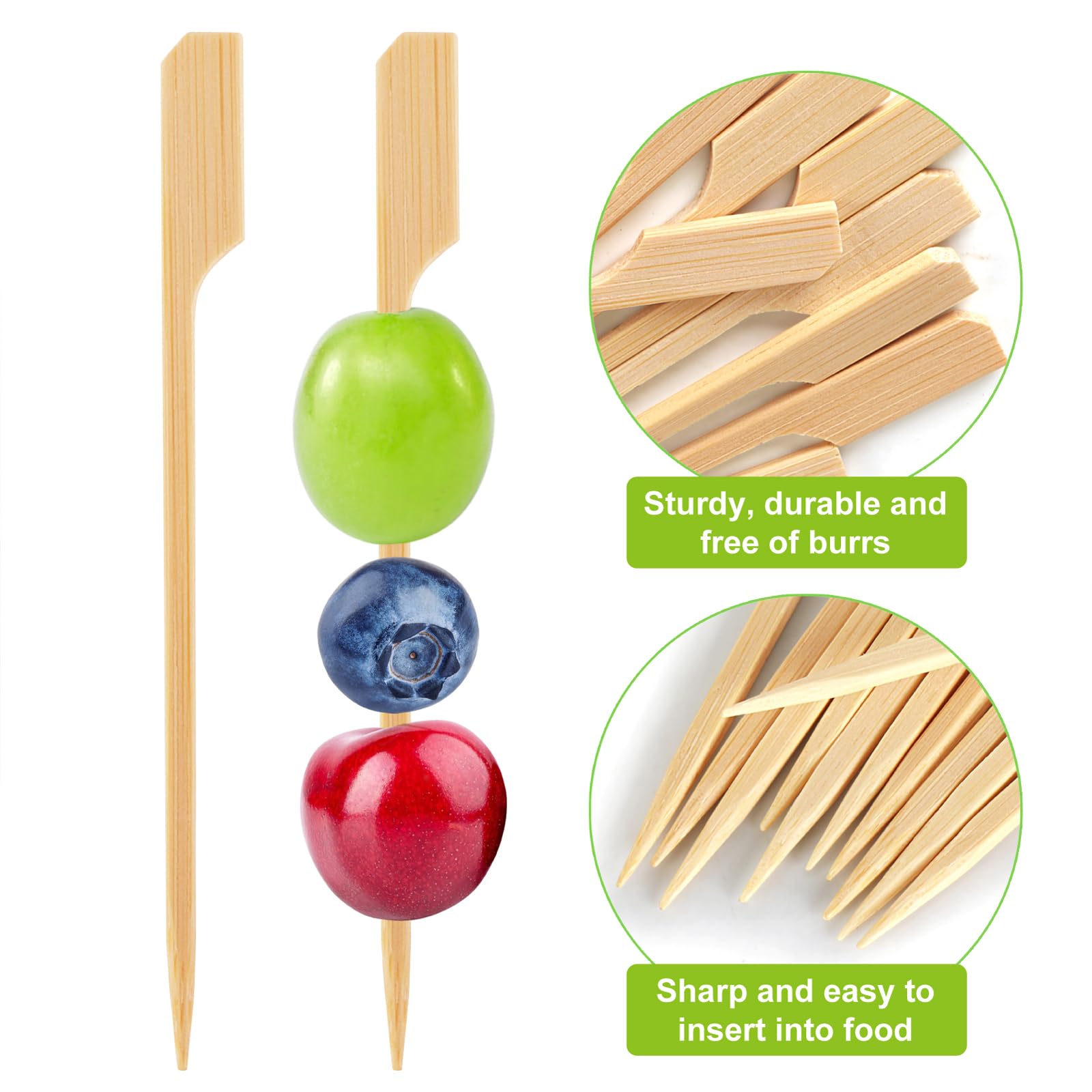 • IMPROVED CRAFTSMANSHIP & GREATER DURABILITY: Our cocktail toothpicks are made from the finest bamboo to ensure their strength and durability, with sharp pointed tips that easily pierce through food. Most importantly, they won't easily split or break, and their smooth, polished surface ensures a comfortable grip for you and your guests, without any pesky splinters to worry about.