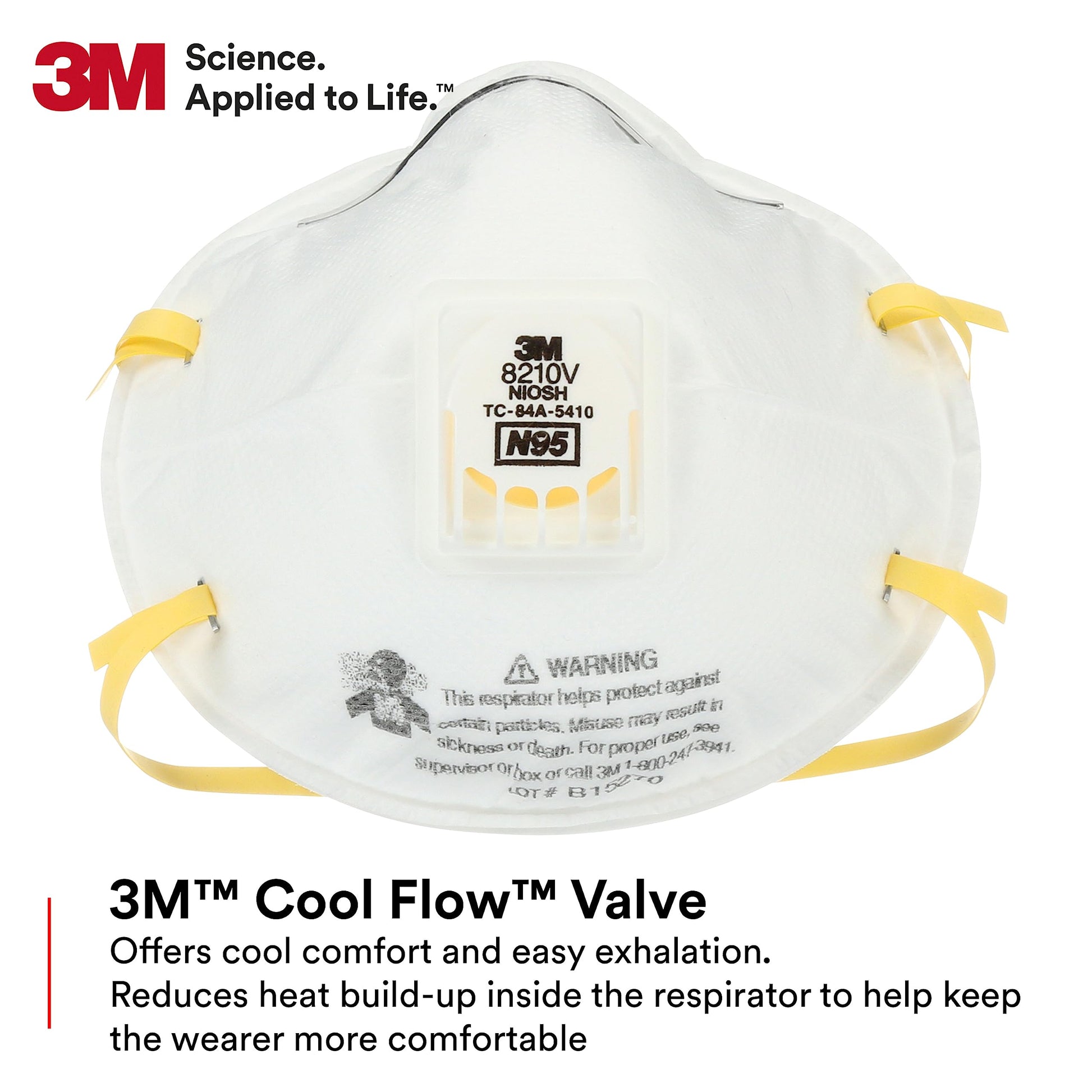 Details: Particulate Respirator 8210V, N95 is a NIOSH approved disposable particulate respirator that helps provide reliable respiratory protection of at least 95% filtration efficiency against certain non-oil based particles. This respirator is designed for use for particles such as those from grinding, sanding, sweeping, sawing, bagging, or other dusty operations. This respirator can also help reduce inhalation exposures to certain airborne biological particles (examples: mold, Bacillus anthracis, Mycobacterium tuberculosis), but cannot eliminate the risk of contracting infection, illness, or disease. The respirator incorporates 3M’s proprietary technology with advanced electrostatically charged microfiber filter media designed for ease of breathing. Designed with a 3M Cool Flow Exhalation Valve, this respirator may be appropriate for work situations involving heat, humidity, or long periods of wear. The proprietary 3M Cool Flow Valve is designed to release exhaled breath quickly, helping to prevent to enhance comfort for respirator wearers. Warning: Respirators help protect against certain airborne contaminants. Before use, the wearer must read and understand the User Instructions provided as a part of the product packaging. Follow all local regulations. In the U. S. , a written respiratory protection program must be implemented meeting all the requirements of OSHA 29 CFR 1910. 134 including training, fit testing and medical evaluation. In Canada, CSA standards Z94. 4 requirements must be met and/or requirements of the applicable jurisdiction, as appropriate. Misuse may result in sickness or death. Disclaimer: 3M industrial and occupational products are intended, labelled, and packaged for sale to trained industrial and occupational customers for workplace use. Unless specifically stated otherwise on the applicable product packaging or literature, these products are not intended, labelled, or packaged for sale to or use by consumers (e. g. , for home, personal, primary or secondary school, recreational/sporting, or other uses not described in the applicable product packaging or literature), and must be selected and used in compliance with applicable health and safety regulations and standards (e. g. , U. S. OSHA, ANSI), as well as all product literature, user instructions, warnings, and limitations. Misuse of 3M industrial and occupational products may result in injury, sickness, or death. For help with product selection and use, consult your on-site safety professional, industrial hygienist, or other subject matter expert. For additional product information, visit www. 3M /PPE.