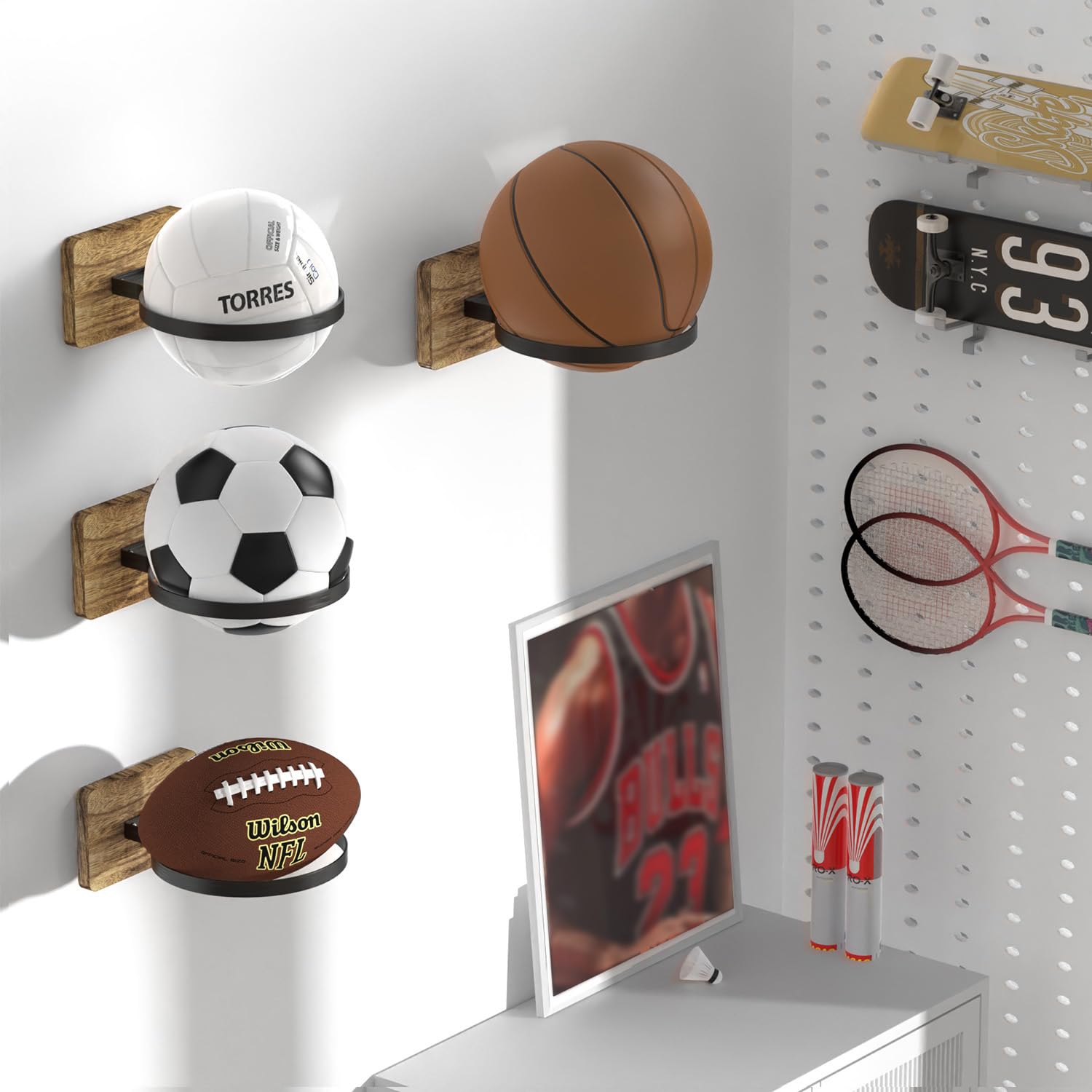 4 Pcs Wall Mount Basketball Holder with Wooden Base, Ball Storage Holders Display Rack for Autograph Basketball, Football, Soccer, Volleyball Collection, Sports Accessories Organizer for Player Fans