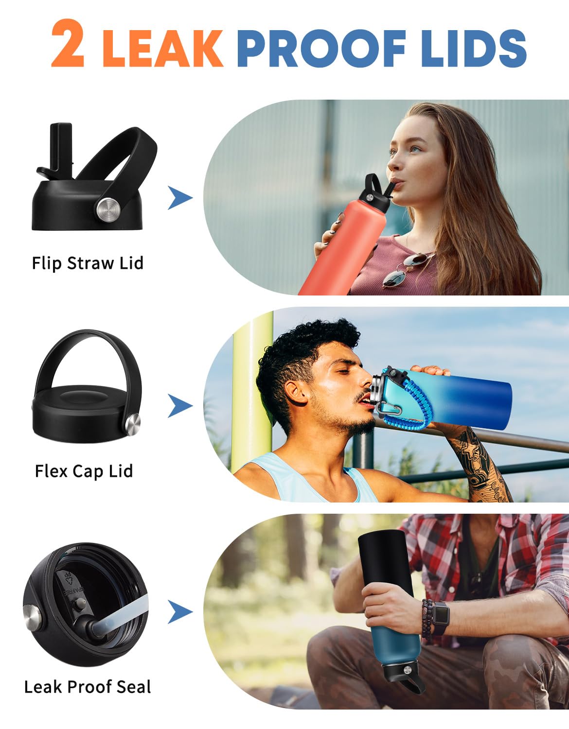• LEAK-PROOF 2 LIDS OPTION: The stainless steel water bottle 40oz metal flask water bottles is equipped with two individual lids to keep beverages fresh and intact all day without transfer of flavor. The wide mouth flex lid for easy drinking and strong tightness for no leaks when you're on the go. The hands-free straw lid for spill-proof sipping and the package comes with an alternative straw & a straw brush for easy cleaning