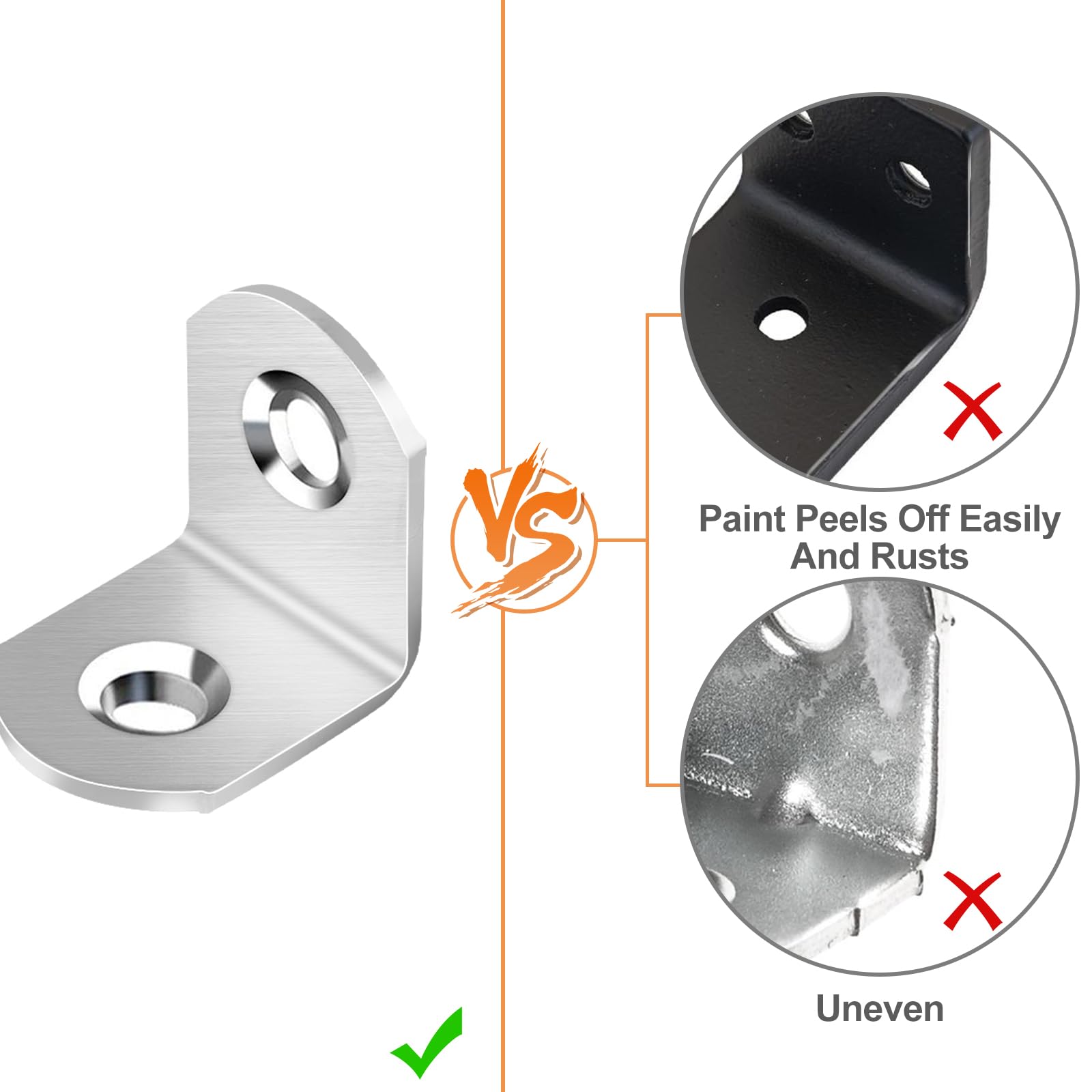 • Premium Material: Our L brackets and screws are made of high quality stainless steel material. Rust-resistant and strong, it will last longer. The minimalist silver finish and rounded edges are smooth without burrs. Don't worry about scratching your hands or furniture during use.