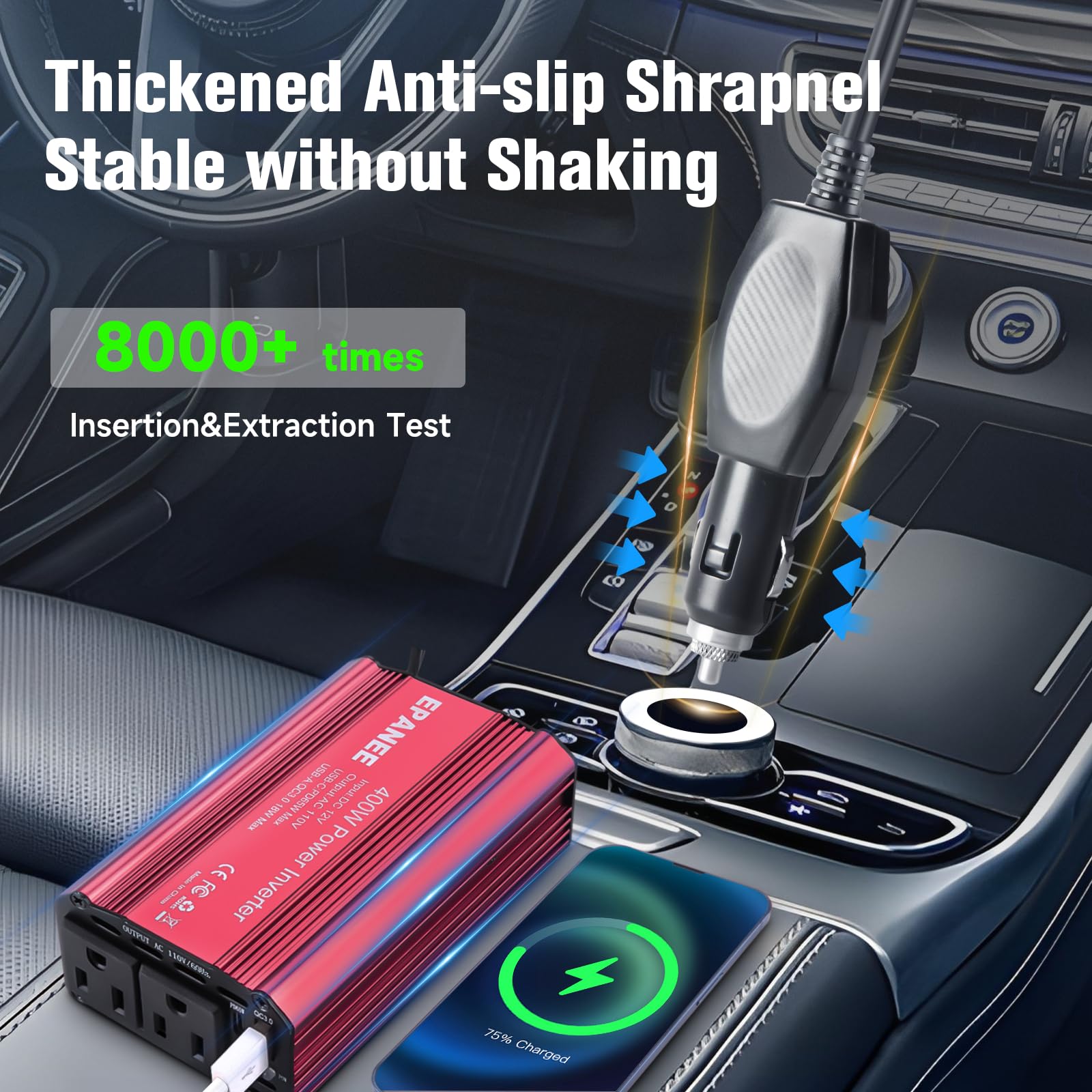 • ใ€๐„๐๐€๐๐„๐„ ๐๐จ๐ฐ๐ž๐ซ ๐ˆ๐ง๐ฏ๐ž๐ซ๐ญ๐ž๐ซ ๐๐š๐ฌ๐ข๐œ๐ฌใ€‘: Our power inverter produces Watts continuous DC to AC power and 800 Watts instantons power, with dual 110V AC power sockets and 1 PD 65W USB-C port and 1 USB-A QC 18W port,this car power inverter can fast charge iphone, macbook and other devices on the trip, and it can also power the air compressor, car vacuum cleaner and other devices.