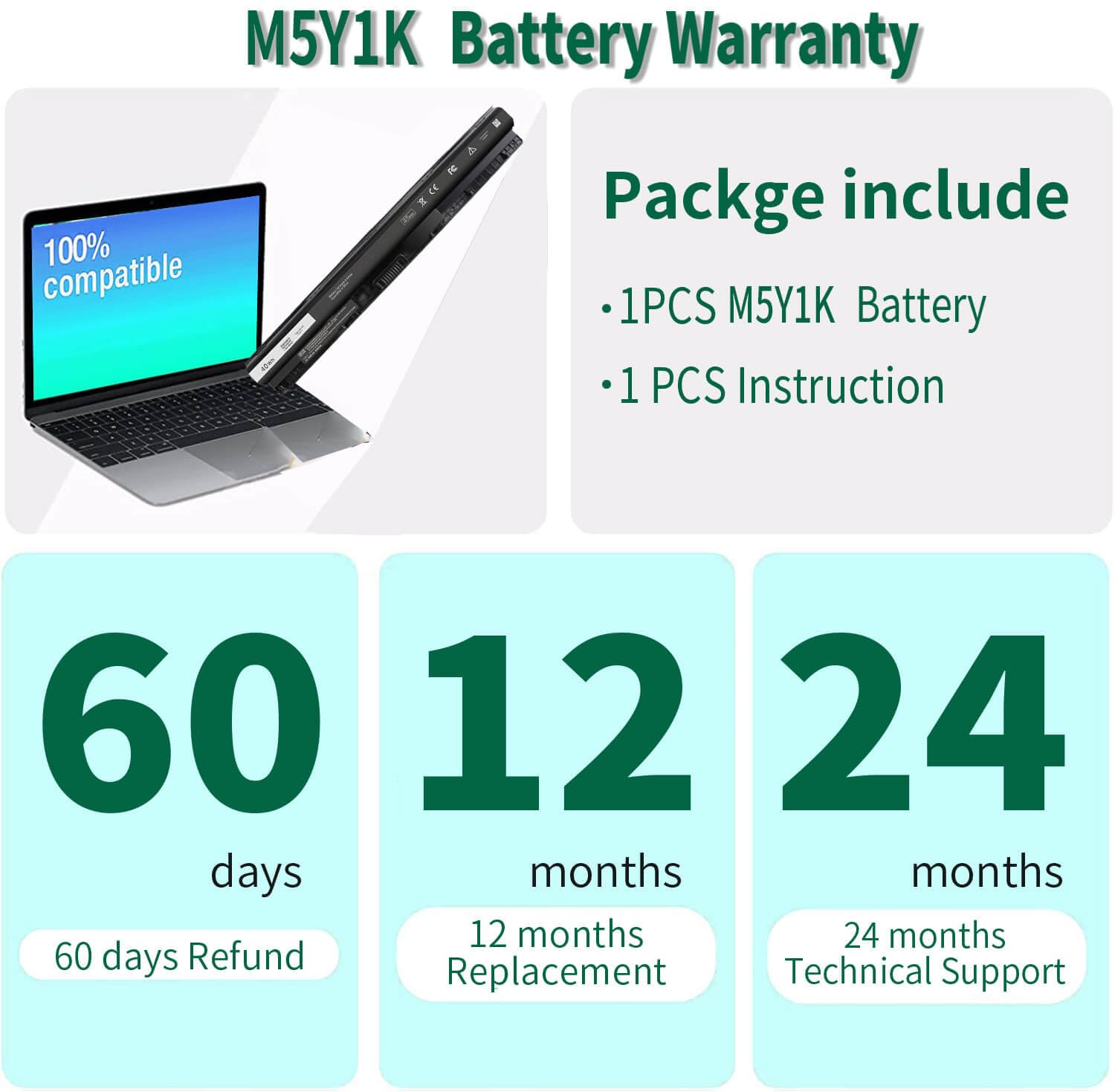 • What You Get: M5Y1K Battery(The internal PCB board of the M5Y1K battery has been upgraded to guarantee full compatibility with the original Dell 40Wh M5Y1K 14.8V battery. It is compatible with computers of any vintage, without any restrictions based on the computer's model year),User Manual for dell 40wh m5y1k 14.8v battery .For assistance with the DELL Laptop Battery 40WH M5Y1K or M5Y1K 14.8V 40WH battery for dell , please visit our product detail page.