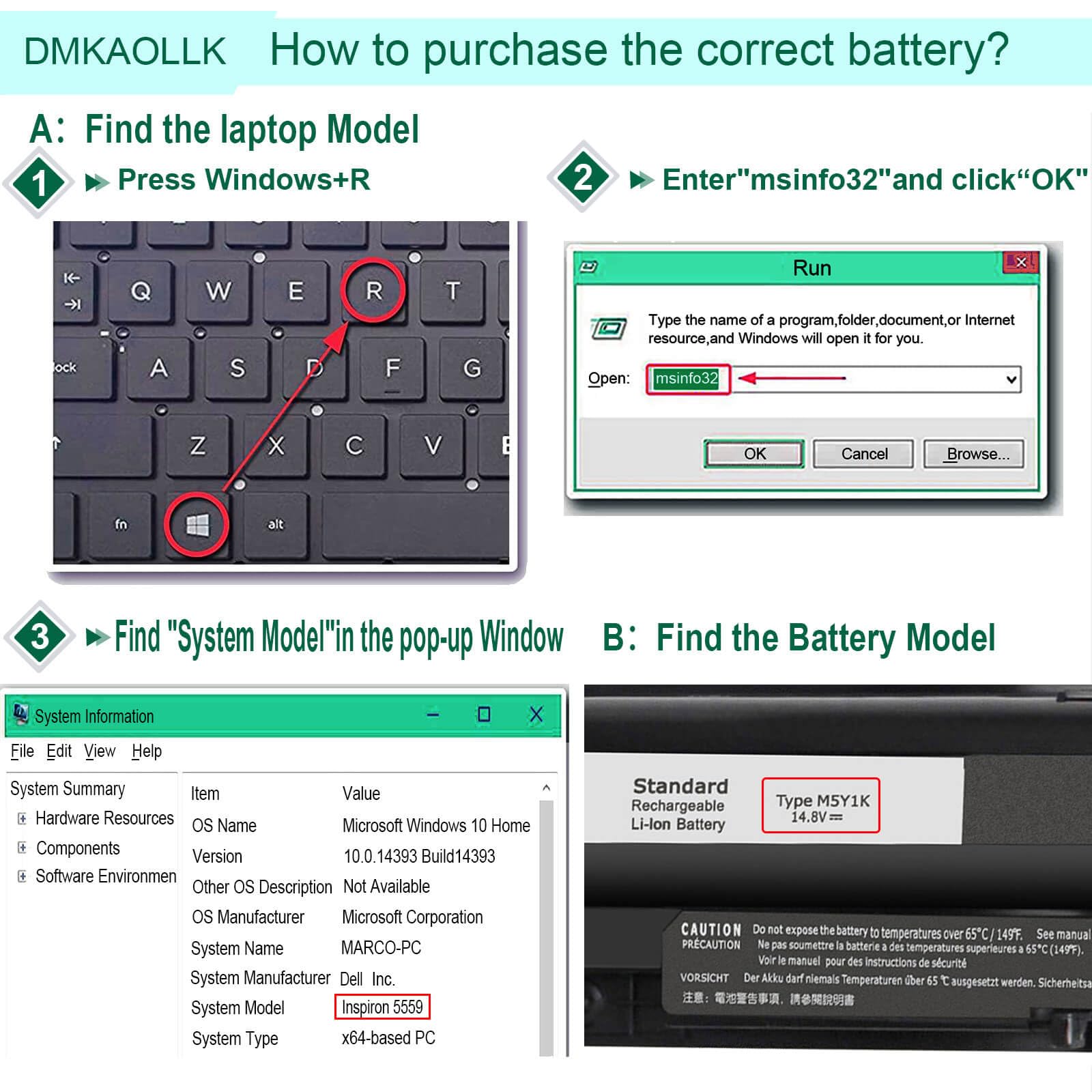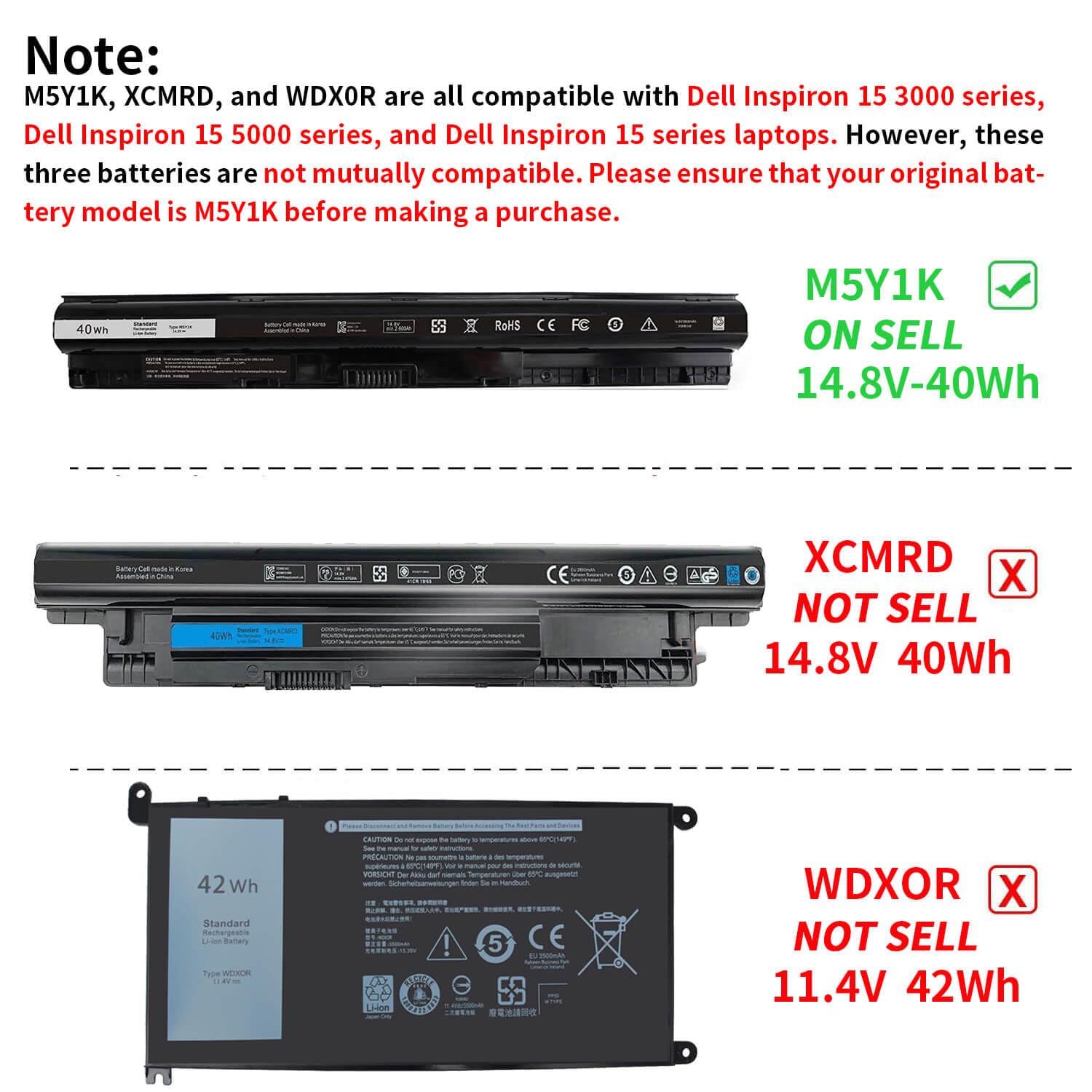 • Compatible for Dell Inspiron 14-3451 14-3452 14-3458 14-3459 14-3462 14-3467 14-5451 14-5452 14-5458 14-5459 14-5455 14-5459 15-3551 15-3552 15-3558 15-3559 15-3565 15-3567 15-5551 15-5552 15-5555 15-5558 15-5559 15-5758 17-5755 17-5756 17-5758 17-5759 laptop Notebook battery, Dell 40Wh Standard Rechargeable Li-ion Battery Type M5Y1K 14.8V