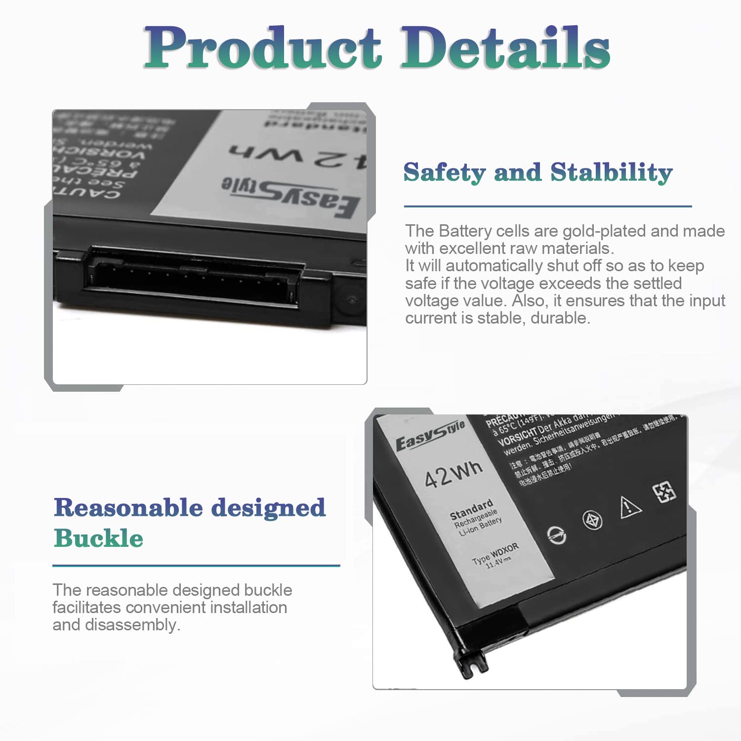• Specification - Dell laptop WDXOR Replacement Battery Type: Li-ion; Voltage: 11.4V; Capacity: 42WH; Cells:3-Cell; Model: WDX0R. !!! Notice!!! Not compatible with 33YDH(56Wh 4-Cell) or YYRD6(42Wh 3-Cell), please check the original battery before purchasing to make sure it is compatible