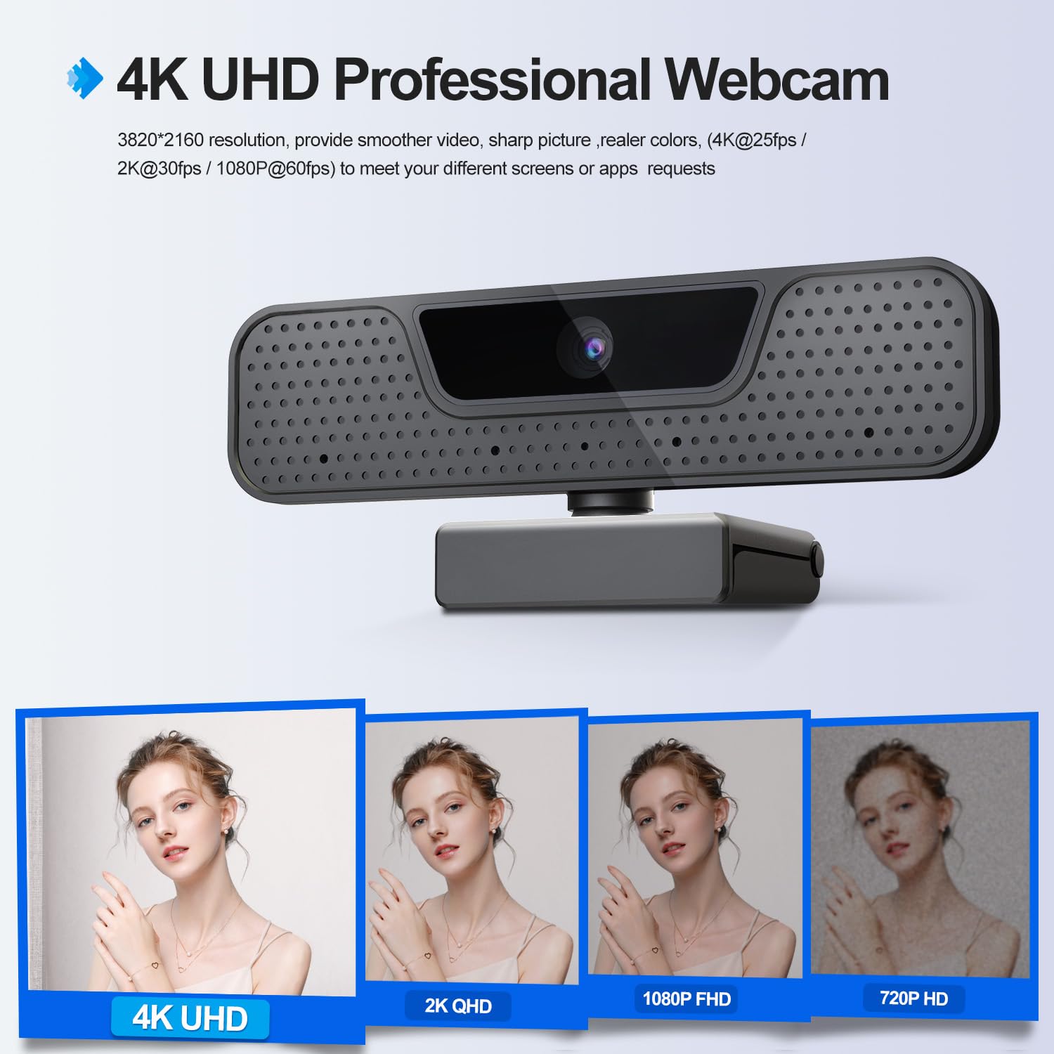 • Unmatched Clarity Solid 4K Streaming & Full HD Video: High-definition 4K 8-megapixel PC external webcam with 1/3”CMOS image sensor features up to a 3840*2160 resolution at 30fps. No false upscaling, only pure 4K quality. Ideal for remote business meetings where every detail matters. The 4K webcam for laptop provides ultra-clear visuals that make you feel like you're in the same room with your colleagues, students, or audience