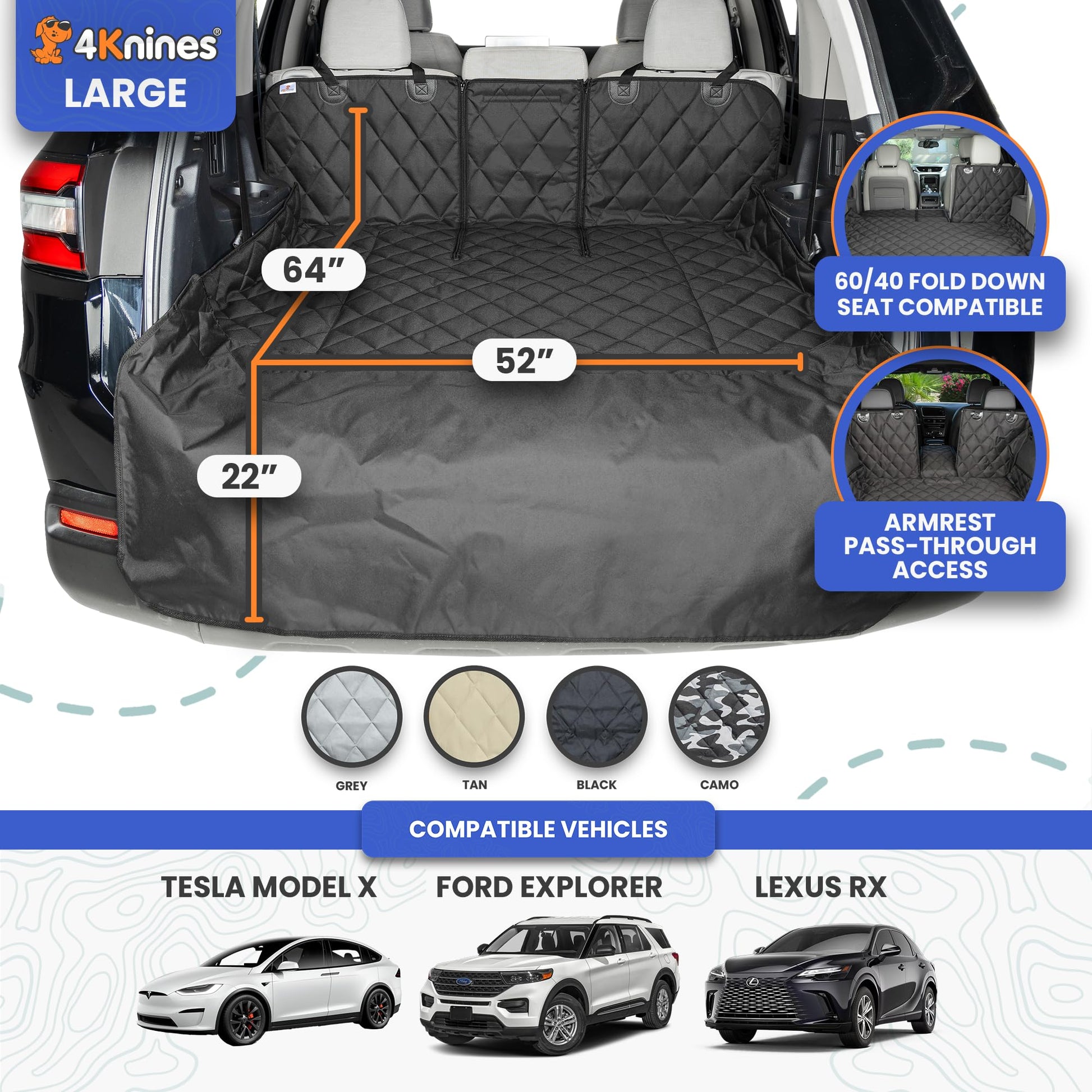 4Knines SUV Cargo Liner for Dogs, Trunk Mat for SUV, Durable Cargo Cover, Protector – Compatible with 60/40 Split Bench & Armrest Pass-Through, Waterproof, Machine Washable, Non-Slip (Large, Black)