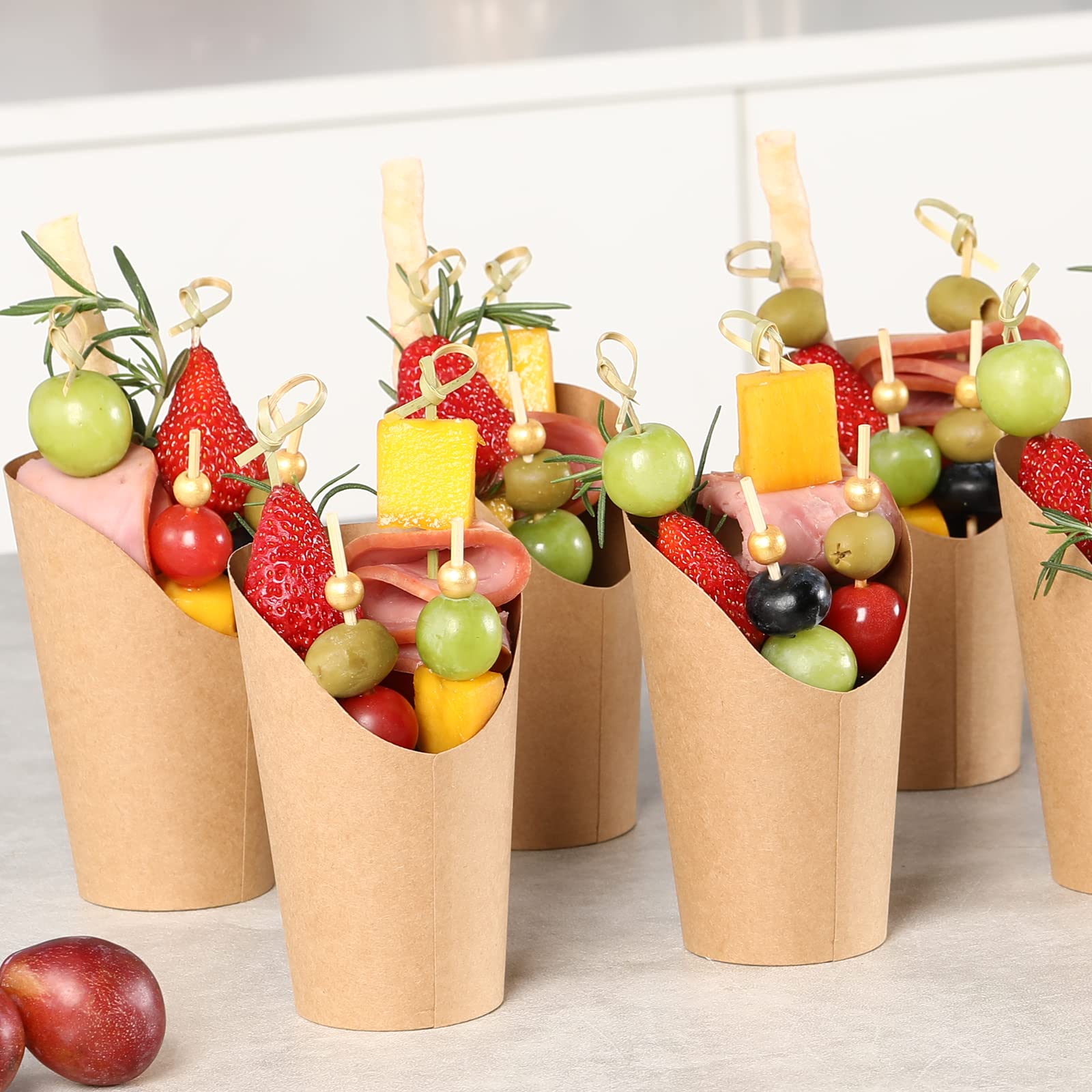 • CREATIVE & PRACTICAL DESIGN: Our brown paper cups combine a low front and high back design, making it easy to put your food in and take it out. With two different styles and lengths of bamboo cocktail picks, they can hold more food and provide versatility for food presentation. You can easily make amazing party food.