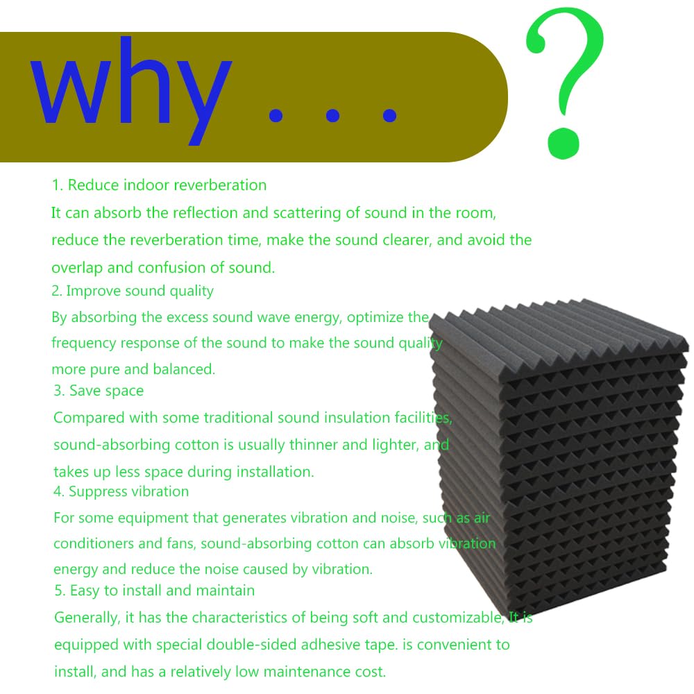 • CoIt is suitable for various public places such as recording studio, listening room, home theater, KTV and so on. Used to absorb medium and high frequencies and reduce echo. Overall noise reduction coefficient. Color: Black Total Size: 30 * 30 *2.5cm (12'*12'*1') Package include: 48PACK