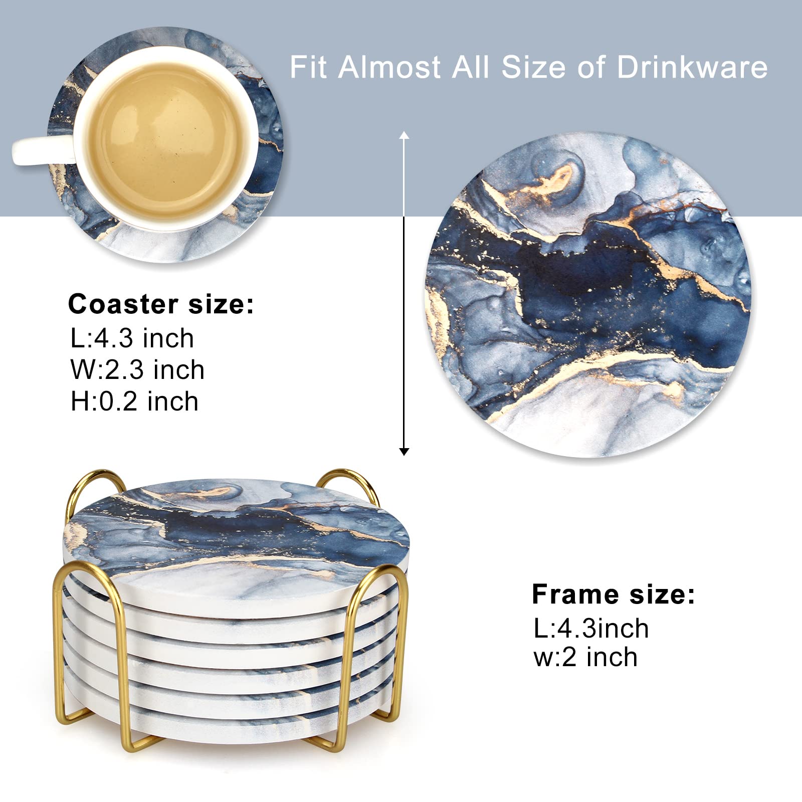 • COASTERS With METAL HOLDER SET: 6 pcs 4" Round ceramic coasters and a 4.5" gold metal coaster holder.