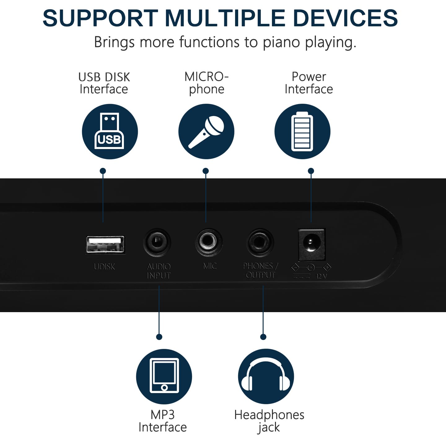 • UNLIMITED CONNECTION: This true full size 61 key keyboard piano is made of premium material. The LCD display can simply and clearly displays the status of the functions being used. With audio input/output/microphone jack(with UDISK port),you can connect microphone and headphone(included), you will not interfere with others when practicing singing and playing late at night, fully enjoy the music