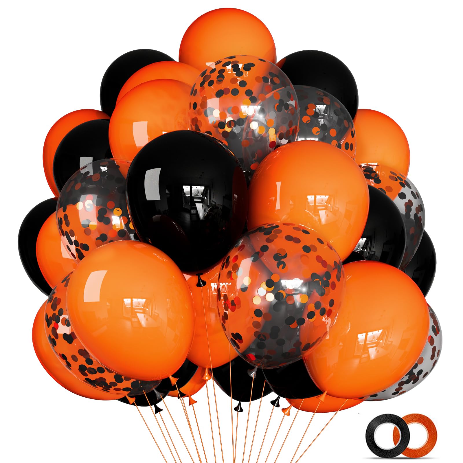 • 🎉【Complete 68-Piece Set】 – Includes 28 black balloons, 28 orange balloons, 12 confetti balloons, and 2 ribbons, offering a complete decorating solution for Halloween, graduation, birthdays, and themed parties.
