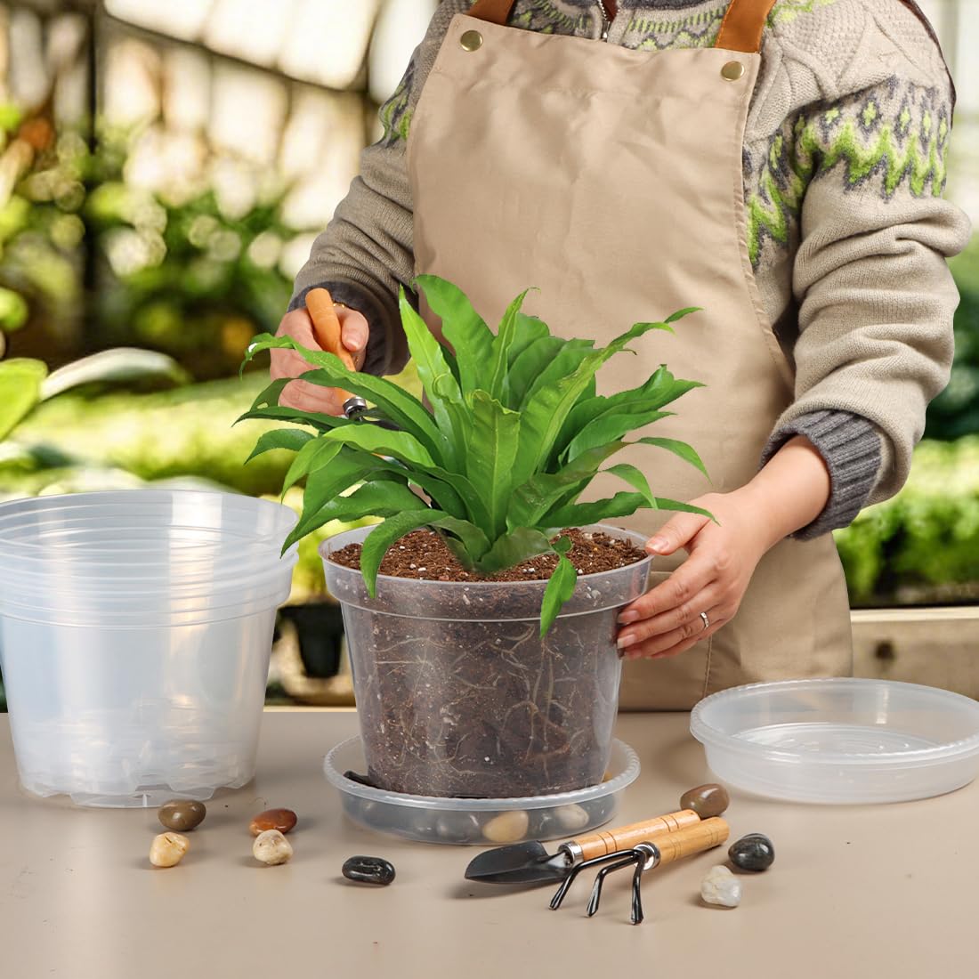 7 Pack 8 Inch Clear Nursery Pots with Saucer, Transparent Plastic Plant Pot with Drainage Holes, Sturdy Plant Starter Pots, Planter Pot for Planting Succulent Flower Herb Vegetable, Gardening Gifts