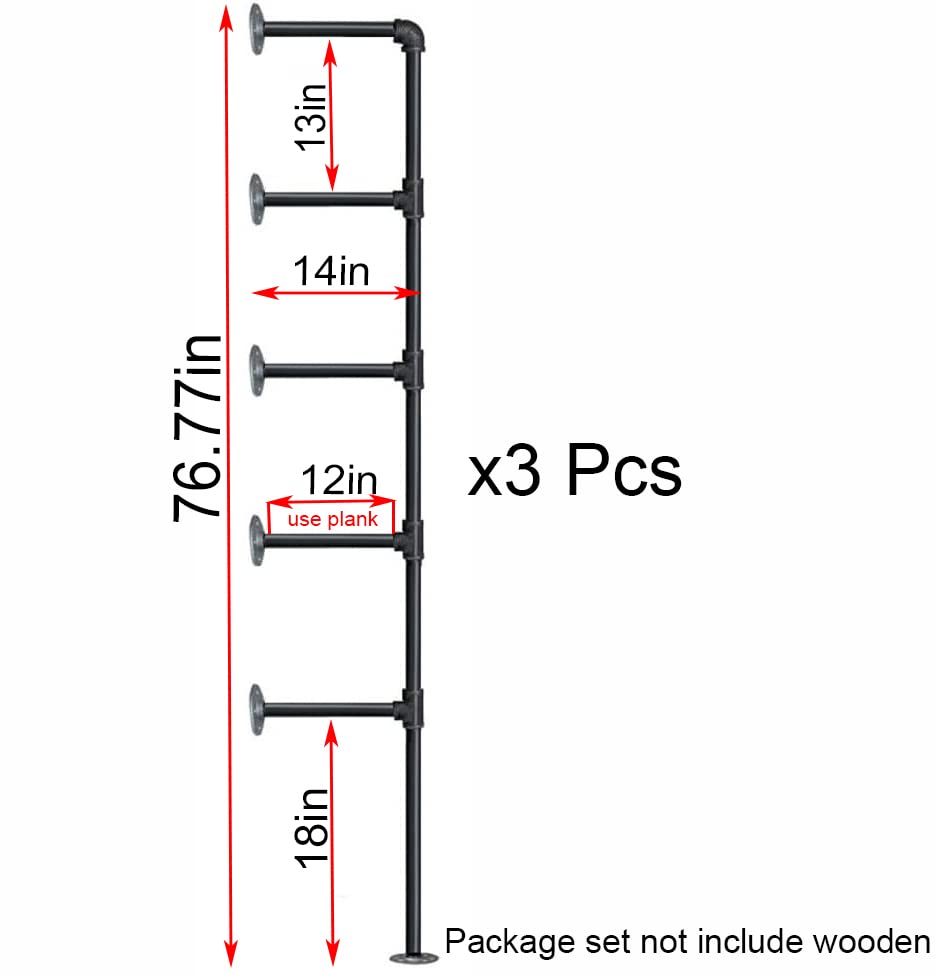 Details: Size: Multiple short pipe freely connected, Total Tall 76.77', 13' in between each tier, deep 14';This shelves system can be standing from floors also can be hung from ceilings.
