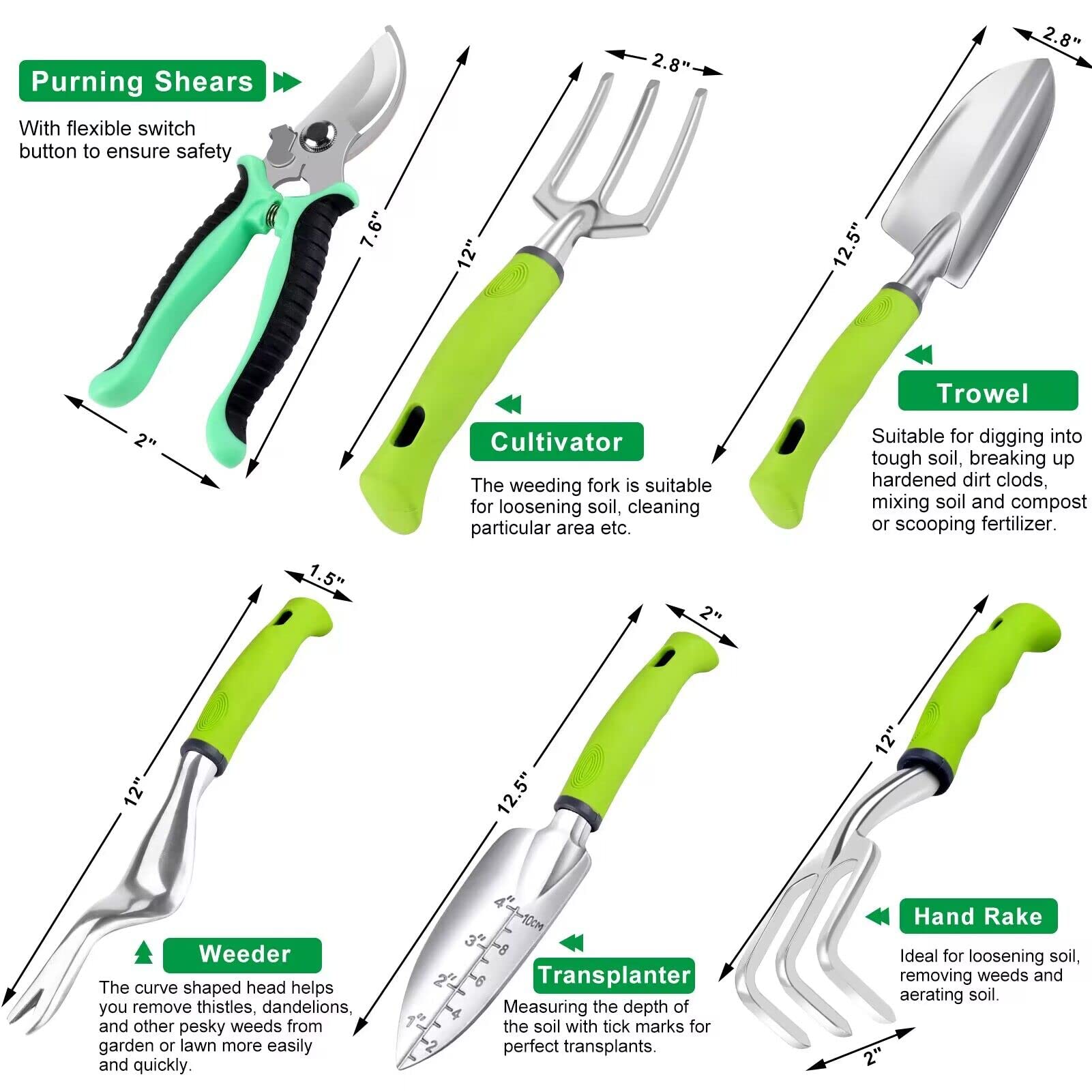 • ►High-quality and Sturdy Gardening Kit:The garden tool organizer with 6 large size metal hand tools are made of heavy-duty aluminum with Ultra-fine Polishing Technology to keep corrosion resistance and toughness. The gardening items are high hardness and no need to worry about rusting and breaking. The garden gifts handle is made of high-quality Tpr rubber with anti-slip performance and comfort to reduce hand and wrists fatigue, gardening gifts providing you with pleasure using experience.